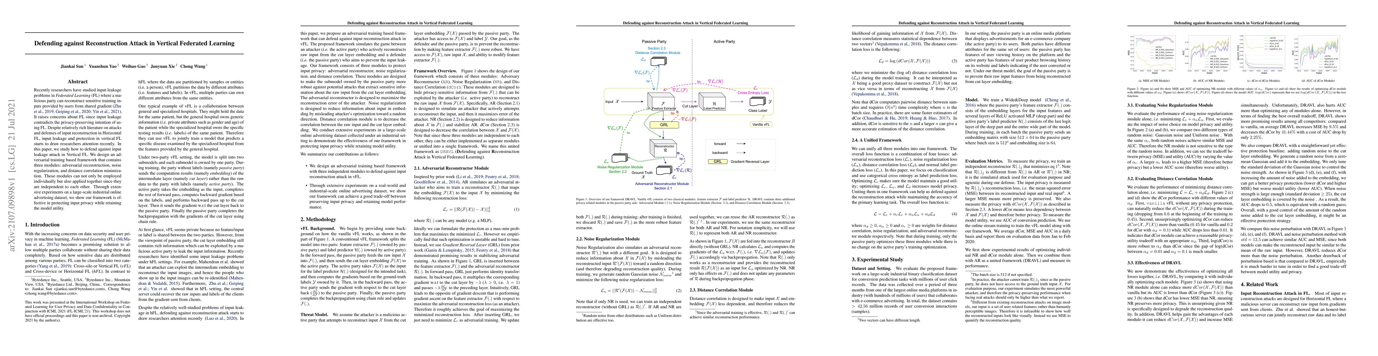 This paper proposes a framework for defending against input leakage attacks in Vertical Federated Learning (VFL) using adversarial training. The framework includes three independent modules: adversarial reconstruction, noise regularization, and distance correlation minimization, which can be used individually or collectively. Experimental results on an industrial dataset demonstrate its effectiveness in safeguarding input privacy while maintaining model performance.