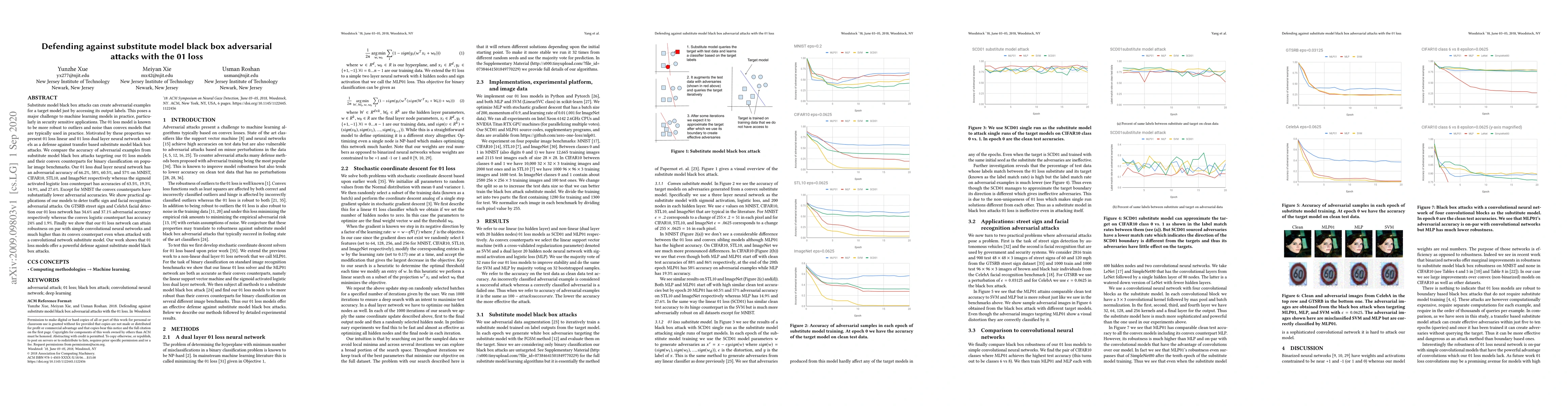 This paper proposes 01 loss linear and dual layer neural network models to defend against substitute model black box adversarial attacks, demonstrating higher adversarial accuracy on image benchmarks compared to their convex counterparts. The 01 loss model shows significant robustness in practical applications like traffic sign and facial recognition, outperforming traditional logistic loss models.