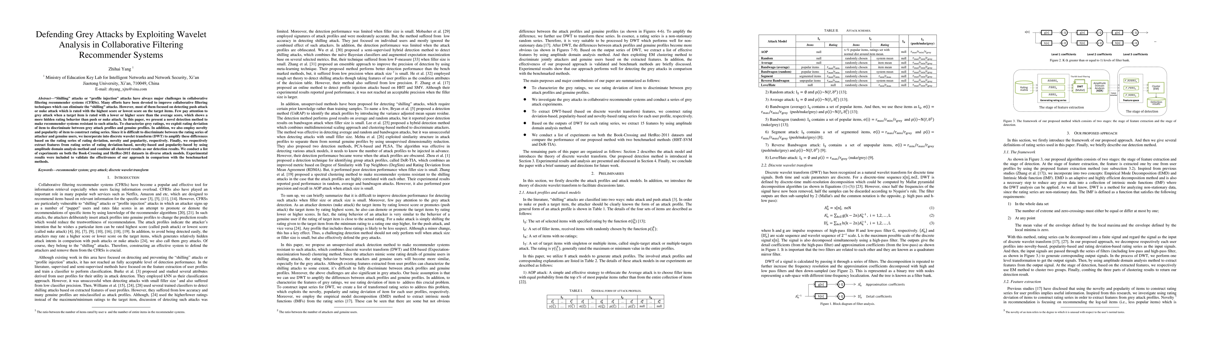 This paper proposes a novel detection method for grey attacks in collaborative filtering recommender systems by exploiting wavelet analysis. It uses rating deviation, novelty, and popularity of items to construct rating series and employs discrete wavelet transform to amplify differences between attacker and genuine user profiles, ultimately extracting features for effective detection. Experiments on Book-Crossing and HetRec-2011 datasets validate the method's effectiveness against grey attacks.