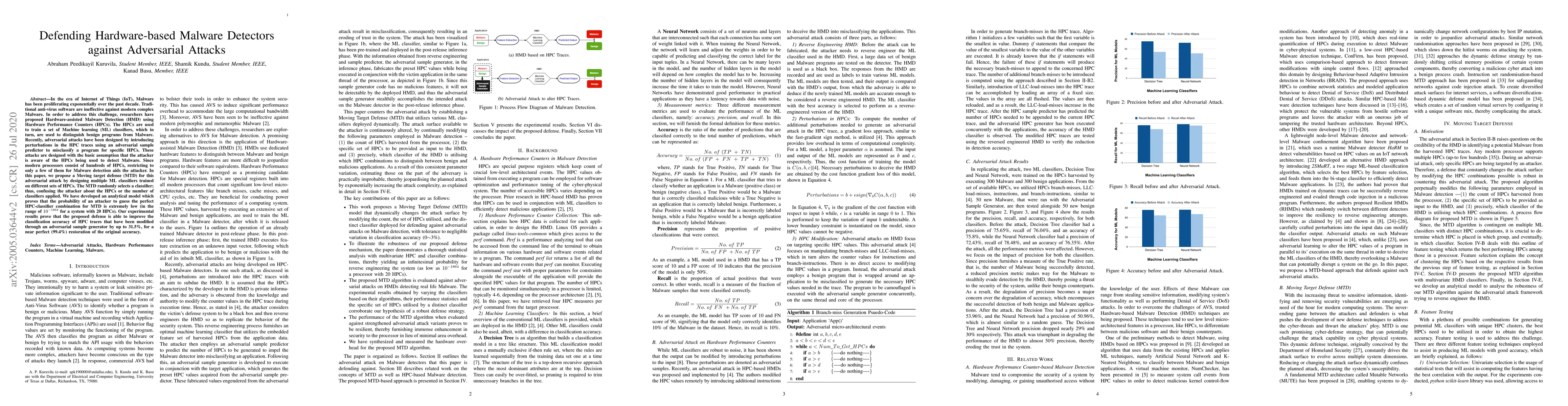 This paper proposes a Moving Target Defense (MTD) to defend against adversarial attacks targeting Hardware-assisted Malware Detection systems. The MTD employs multiple machine learning classifiers trained on different sets of Hardware Performance Counters, randomly selecting among them to confuse attackers, thereby significantly reducing the likelihood of successful adversarial attacks.