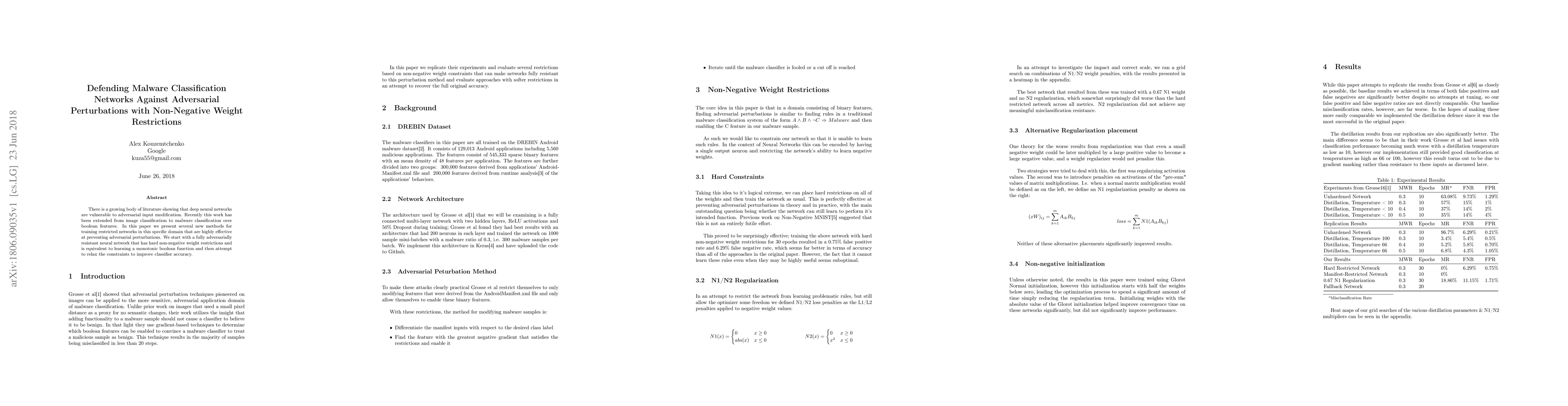 This paper introduces new training methods for malware classification networks that use non-negative weight restrictions to defend against adversarial perturbations. It starts with a fully resistant network and gradually relaxes constraints to enhance accuracy.