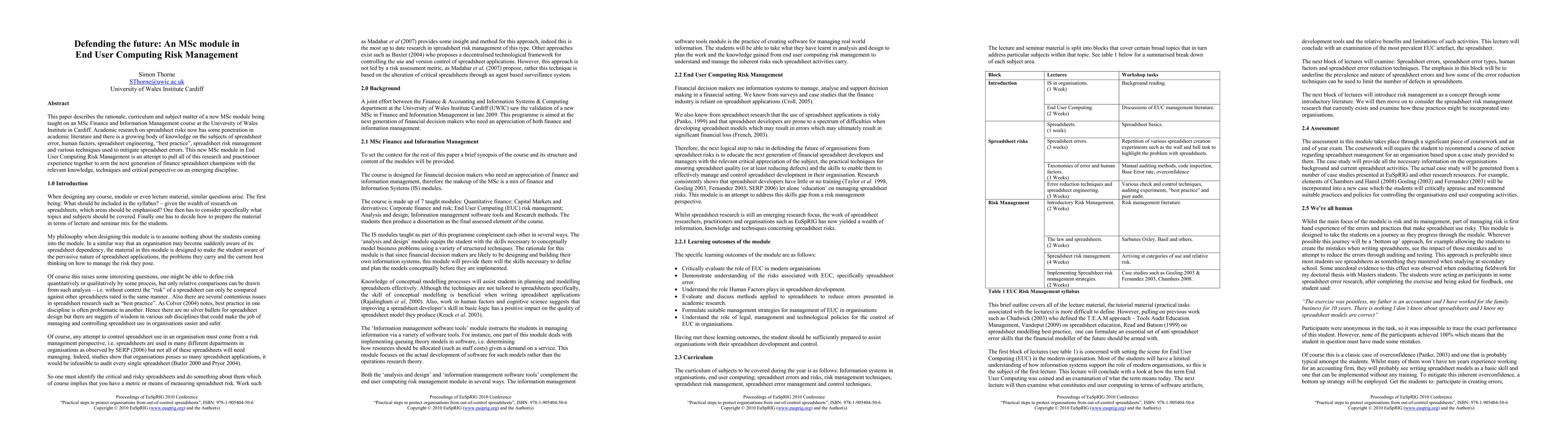 This paper describes the rationale, curriculum and subject matter of a new MSc module being taught on an MSc Finance and Information Management course at the University of Wales Institute in Cardiff. Academic research on spreadsheet risks now has some penetration in academic literature and there is a growing body of knowledge on the subjects of spreadsheet error, human factors, spreadsheet engineering, "best practice", spreadsheet risk management and various techniques used to mitigate spreadsheet errors. This new MSc module in End User Computing Risk Management is an attempt to pull all of this research and practitioner experience together to arm the next generation of finance spreadsheet champions with the relevant knowledge, techniques and critical perspective on an emerging discipline.