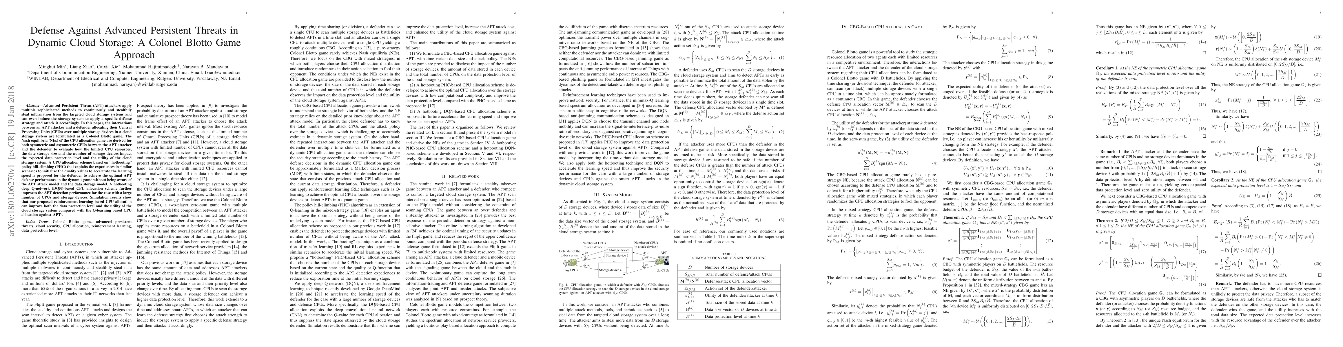 This paper formulates the defense against Advanced Persistent Threats (APTs) in cloud storage as a Colonel Blotto game, deriving Nash equilibria for CPU allocation strategies. It proposes a reinforcement learning-based CPU allocation scheme, including a hotbooting policy hill-climbing and a deep Q-network approach, to optimize APT defense performance, demonstrating improved data protection and utility over traditional Q-learning methods.