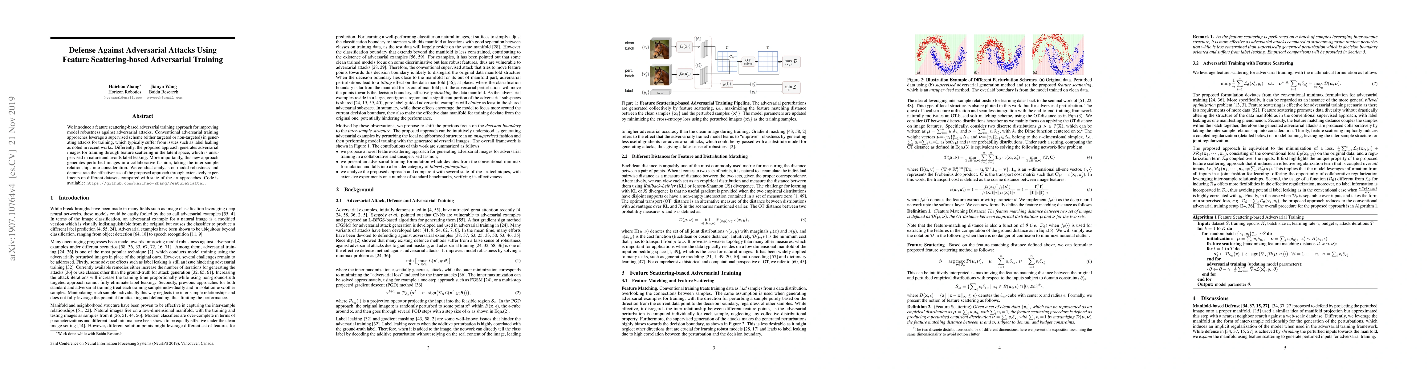 This paper proposes a feature scattering-based adversarial training method to enhance model robustness against adversarial attacks. Unlike conventional methods, this approach generates adversarial examples in an unsupervised manner, avoiding label leaking and considering inter-sample relationships, which is demonstrated to be effective through extensive experiments.