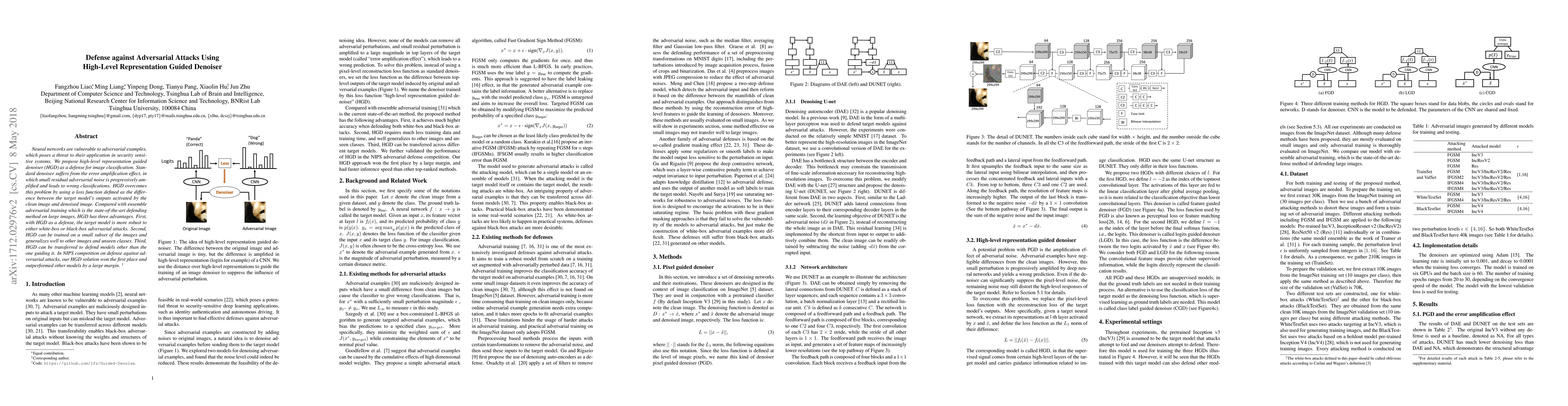This paper proposes a high-level representation guided denoiser (HGD) to defend neural networks against adversarial attacks, showing superior robustness compared to ensemble adversarial training. HGD effectively reduces error amplification and generalizes well, even when trained on a small subset of images.