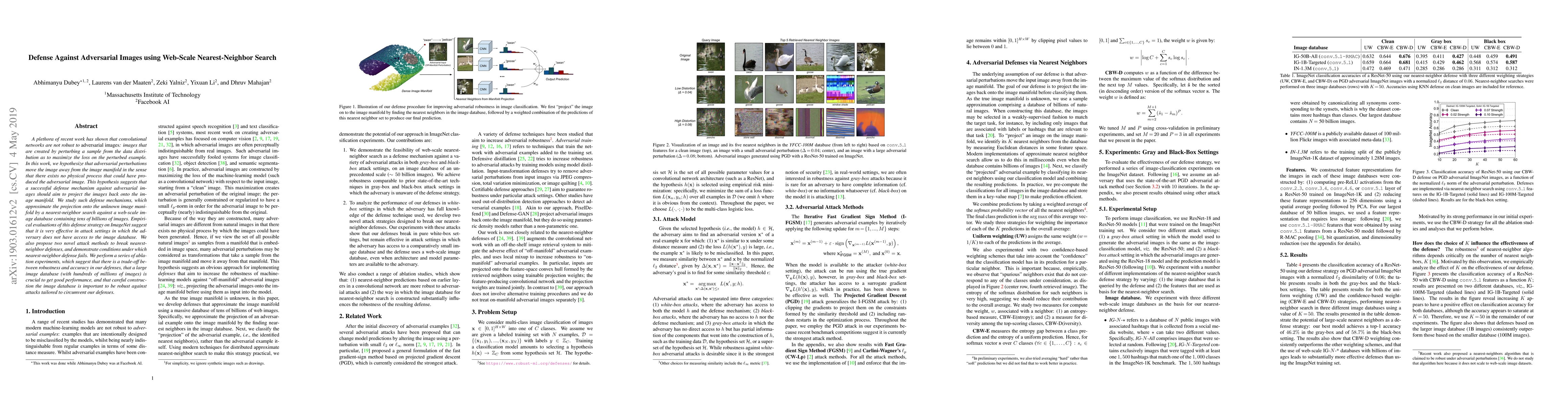 The paper proposes a defense mechanism against adversarial images using web-scale nearest-neighbor search, hypothesizing that adversarial perturbations move images away from the image manifold. Empirical evaluations are conducted on ImageNet, demonstrating the effectiveness of the defense in gray-box attack settings without adversary access to the image database.
