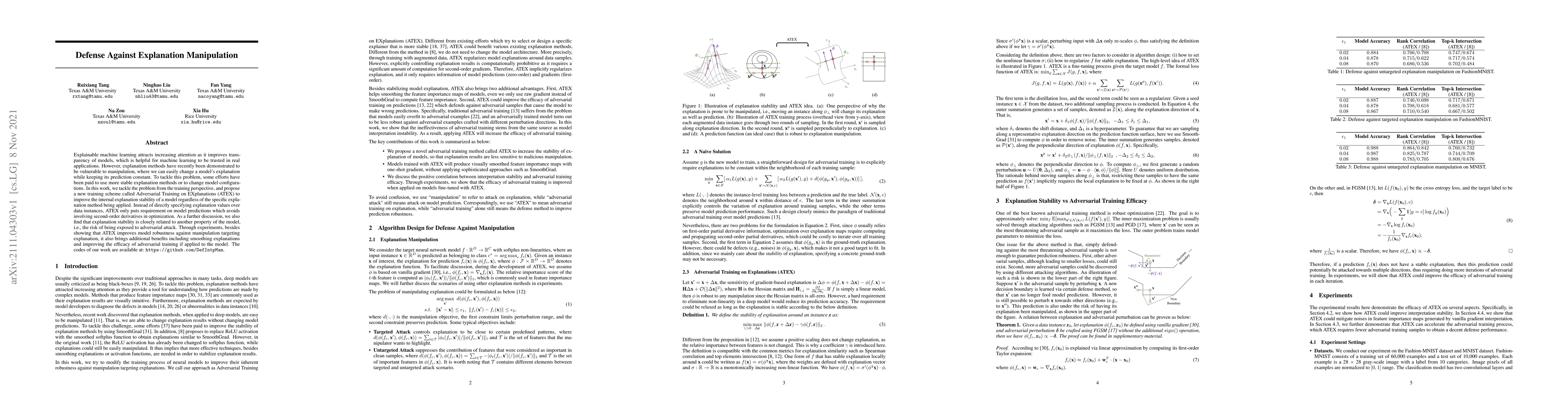 Explainable machine learning attracts increasing attention as it improves transparency of models, which is helpful for machine learning to be trusted in real applications. However, explanation methods have recently been demonstrated to be vulnerable to manipulation, where we can easily change a model's explanation while keeping its prediction constant. To tackle this problem, some efforts have been paid to use more stable explanation methods or to change model configurations. In this work, we tackle the problem from the training perspective, and propose a new training scheme called Adversarial Training on EXplanations (ATEX) to improve the internal explanation stability of a model regardless of the specific explanation method being applied. Instead of directly specifying explanation values over data instances, ATEX only puts requirement on model predictions which avoids involving second-order derivatives in optimization. As a further discussion, we also find that explanation stability is closely related to another property of the model, i.e., the risk of being exposed to adversarial attack. Through experiments, besides showing that ATEX improves model robustness against manipulation targeting explanation, it also brings additional benefits including smoothing explanations and improving the efficacy of adversarial training if applied to the model.