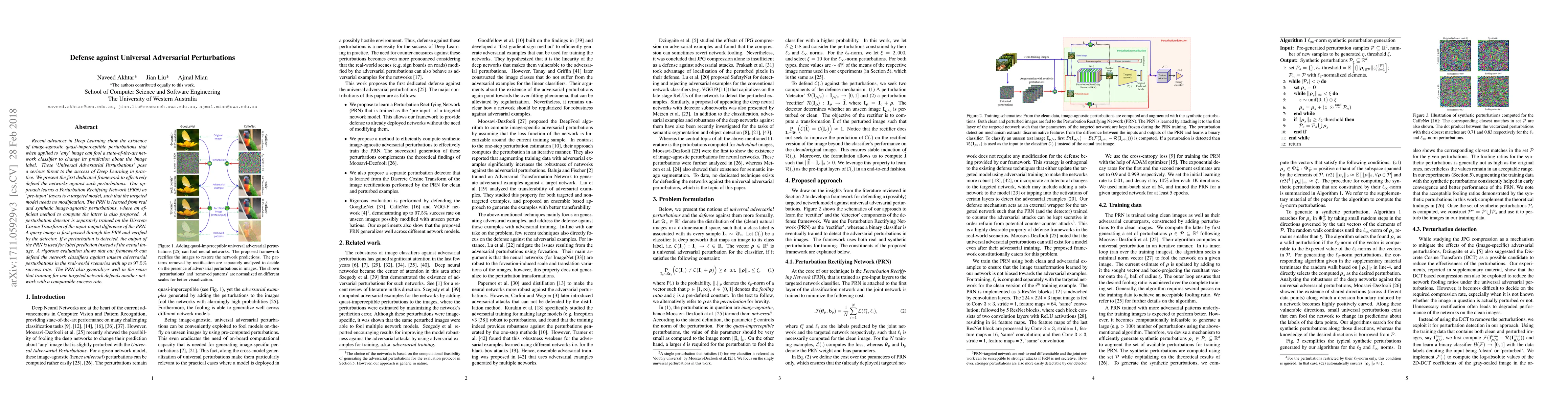 This paper introduces a framework to defend against Universal Adversarial Perturbations that can fool deep learning classifiers. It employs a Perturbation Rectifying Network (PRN) to preprocess images and a perturbation detector to identify adversarial attacks, achieving a 97.5% success rate in defending against unseen perturbations.