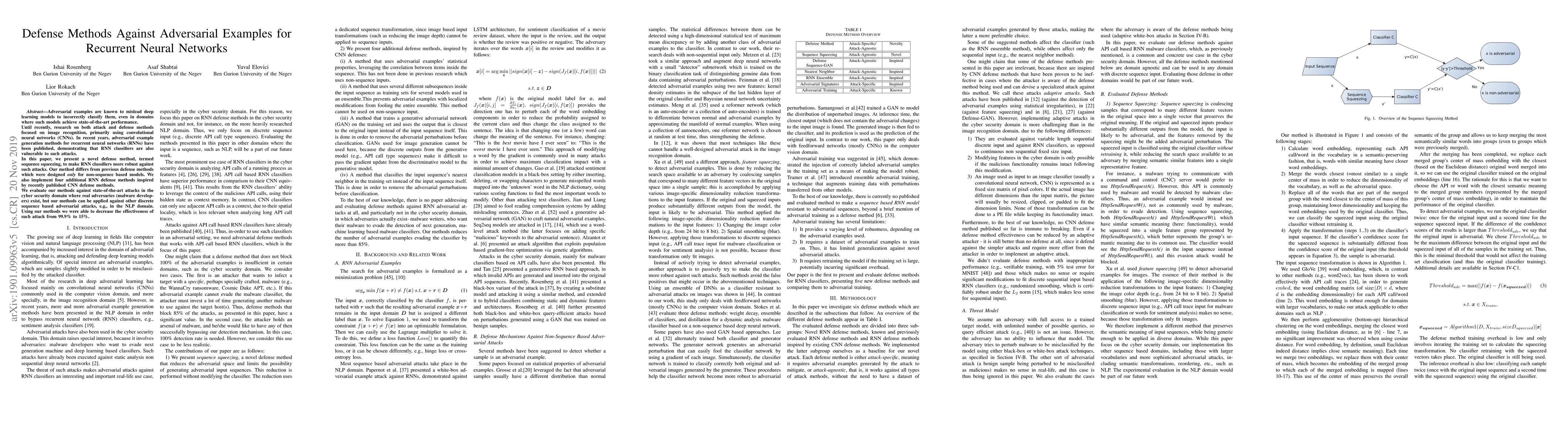 This paper introduces a novel defense method called sequence squeezing to enhance the robustness of recurrent neural networks (RNNs) against adversarial examples. It also evaluates four additional defense strategies adapted from CNN defenses, showing a significant reduction in attack effectiveness from 99.9% to 15% in cybersecurity applications.
