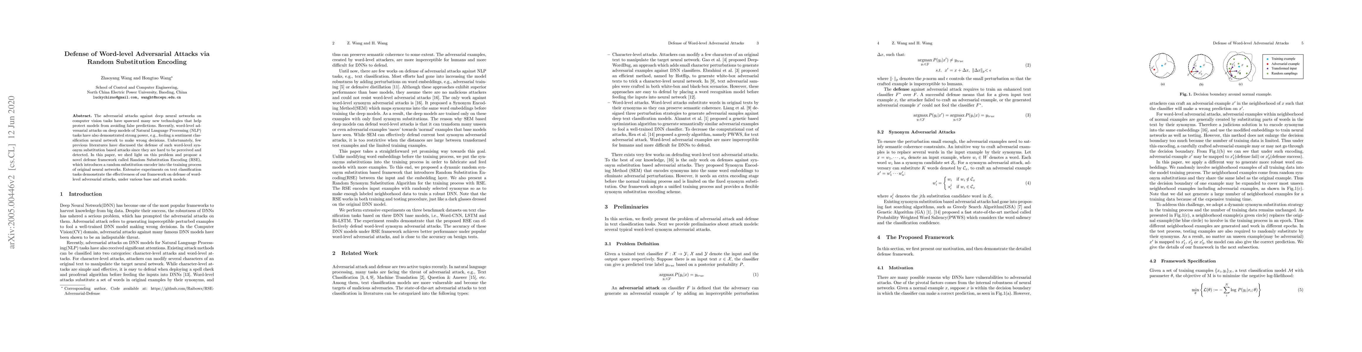 This paper proposes a novel defense framework called Random Substitution Encoding (RSE) to protect NLP models from word-level adversarial attacks. The RSE introduces a random substitution encoder during training, which effectively defends against synonym substitution attacks, as demonstrated through experiments on text classification tasks.