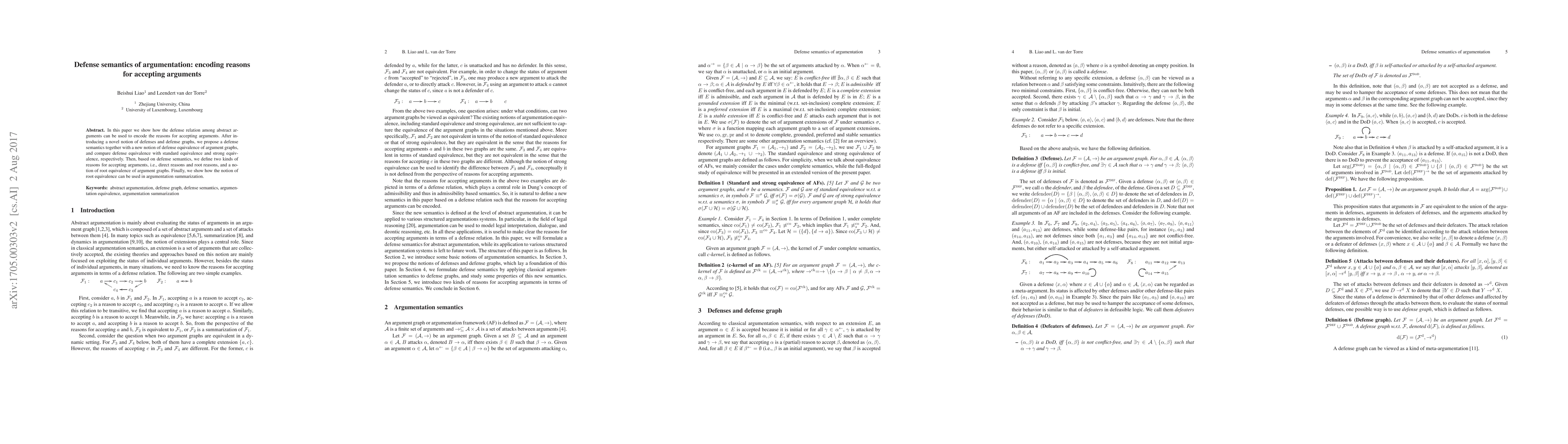 In this paper we show how the defense relation among abstract arguments can be used to encode the reasons for accepting arguments. After introducing a novel notion of defenses and defense graphs, we propose a defense semantics together with a new notion of defense equivalence of argument graphs, and compare defense equivalence with standard equivalence and strong equivalence, respectively. Then, based on defense semantics, we define two kinds of reasons for accepting arguments, i.e., direct reasons and root reasons, and a notion of root equivalence of argument graphs. Finally, we show how the notion of root equivalence can be used in argumentation summarization.