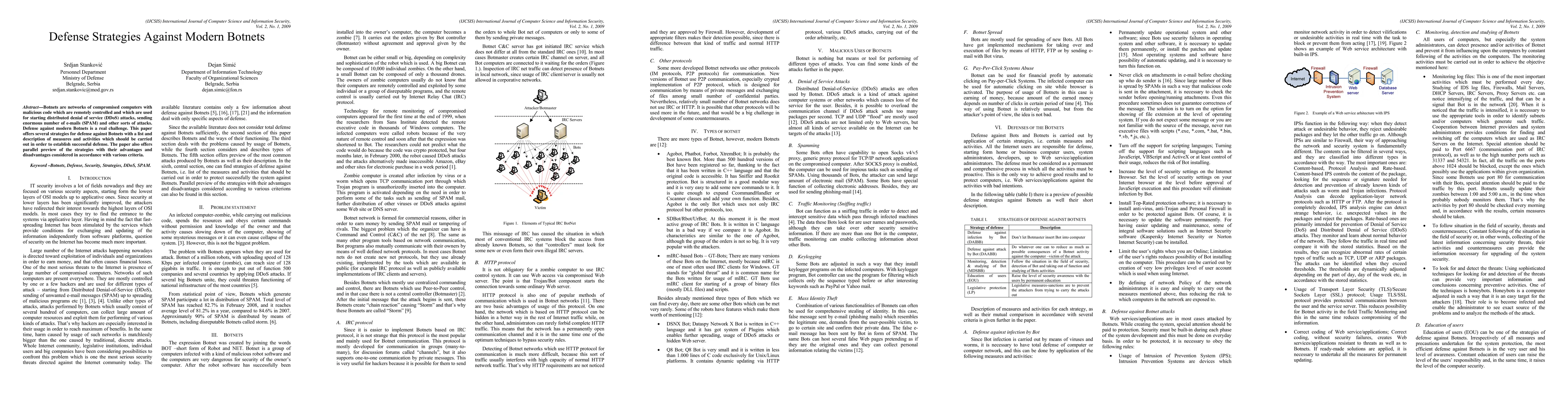 This paper presents multiple strategies for defending against modern botnets, detailing specific measures and activities to establish effective defense. It also evaluates these strategies, highlighting their advantages and disadvantages across various criteria.