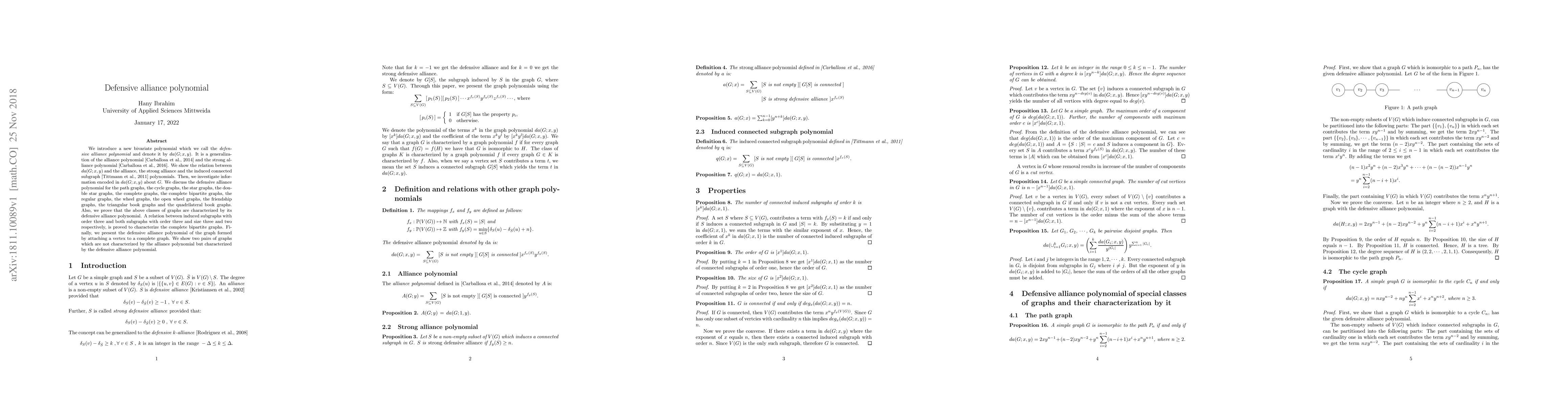The defensive alliance polynomial generalizes the alliance and strong alliance polynomials, encoding information about graph structures. It characterizes various graph classes and identifies pairs of graphs distinguished by this polynomial, unlike the alliance polynomial.