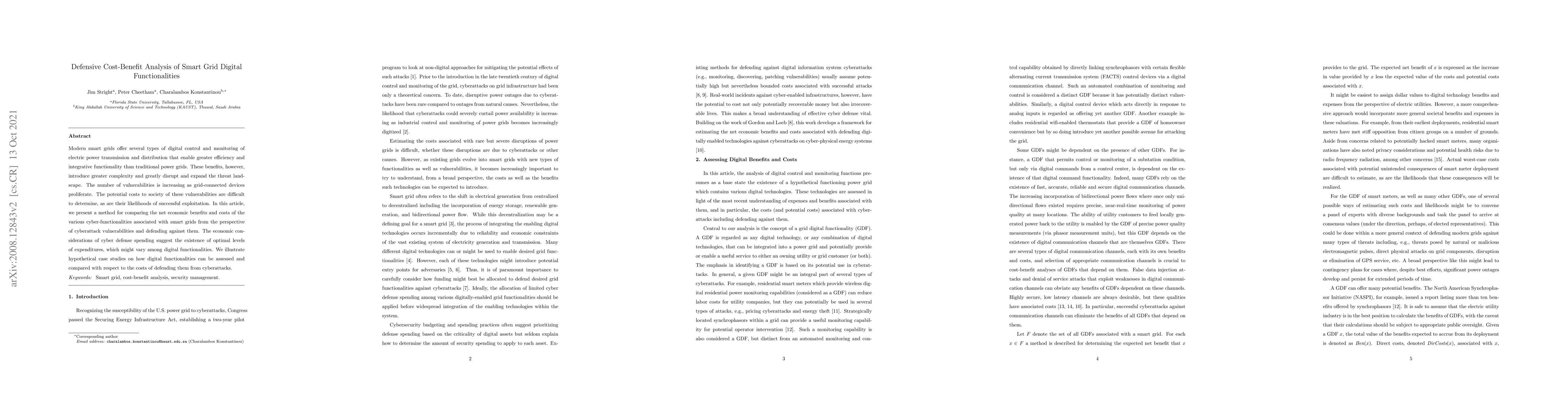 Modern smart grids offer several types of digital control and monitoring of electric power transmission and distribution that enable greater efficiency and integrative functionality than traditional power grids. These benefits, however, introduce greater complexity and greatly disrupt and expand the threat landscape. The number of vulnerabilities is increasing as grid-connected devices proliferate. The potential costs to society of these vulnerabilities are difficult to determine, as are their likelihoods of successful exploitation. In this article, we present a method for comparing the net economic benefits and costs of the various cyber-functionalities associated with smart grids from the perspective of cyberattack vulnerabilities and defending against them. The economic considerations of cyber defense spending suggest the existence of optimal levels of expenditures, which might vary among digital functionalities. We illustrate hypothetical case studies on how digital functionalities can be assessed and compared with respect to the costs of defending them from cyberattacks.