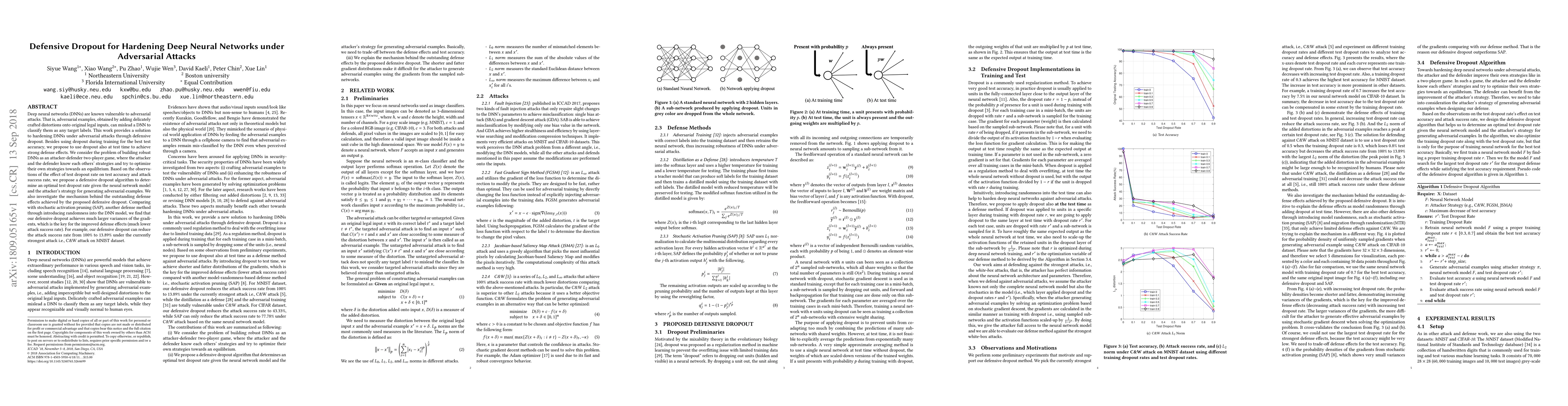 This paper proposes defensive dropout to harden deep neural networks against adversarial attacks by introducing dropout at test time. The method achieves strong defense by inducing larger gradient variances, significantly reducing attack success rates compared to stochastic activation pruning. For instance, it lowers the attack success rate from 100% to 13.89% against the strongest C&W attack on the MNIST dataset.