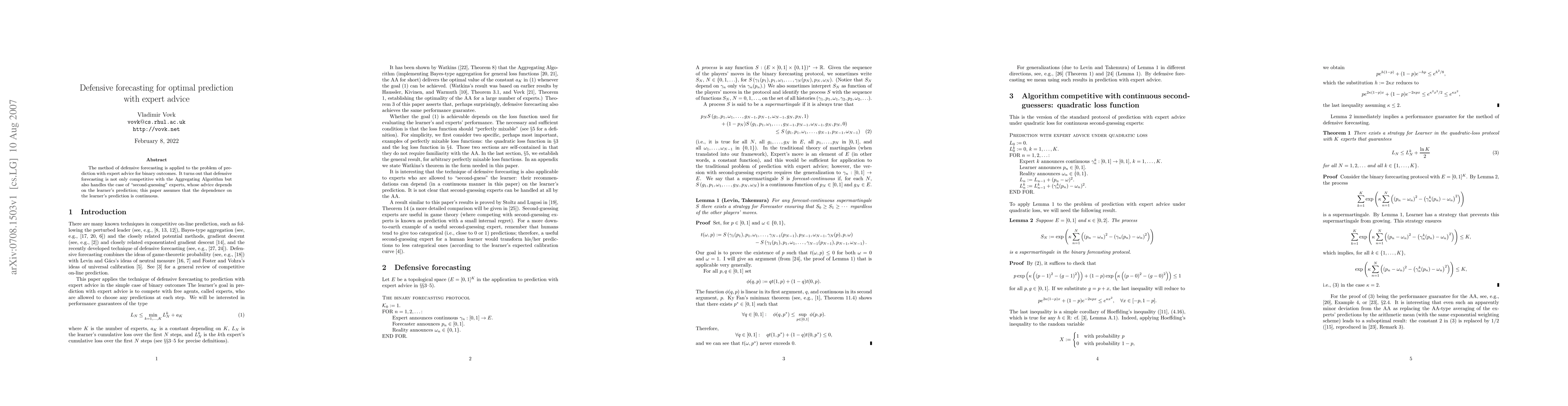 Defensive forecasting offers a competitive approach to prediction with expert advice for binary outcomes, rivaling the Aggregating Algorithm, and effectively manages "second-guessing" experts whose advice is continuously contingent on the learner’s predictions.
