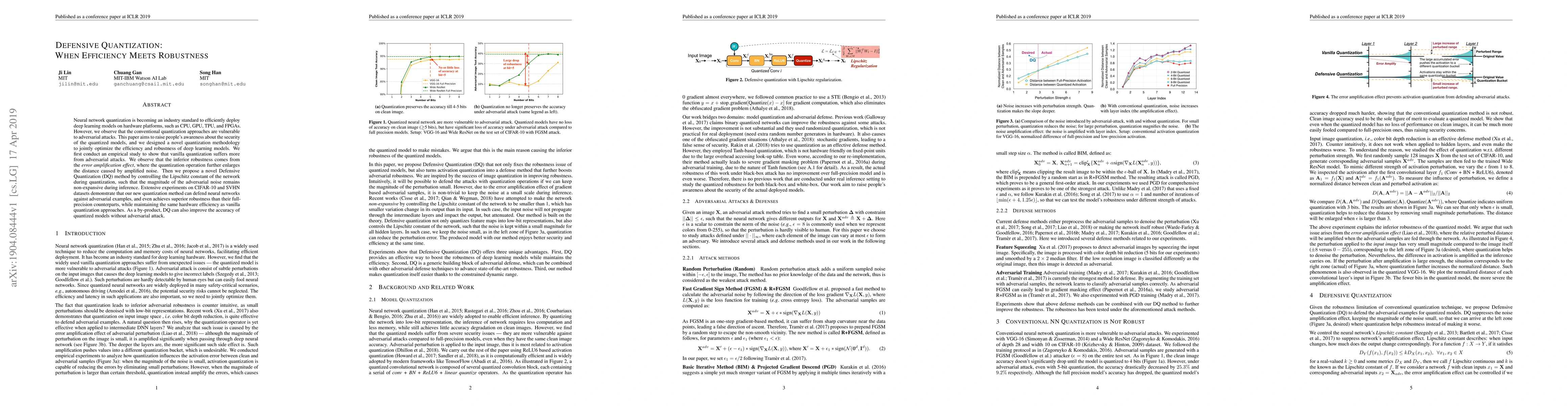 Neural network quantization is becoming an industry standard to efficiently deploy deep learning models on hardware platforms, such as CPU, GPU, TPU, and FPGAs. However, we observe that the conventional quantization approaches are vulnerable to adversarial attacks. This paper aims to raise people's awareness about the security of the quantized models, and we designed a novel quantization methodology to jointly optimize the efficiency and robustness of deep learning models. We first conduct an empirical study to show that vanilla quantization suffers more from adversarial attacks. We observe that the inferior robustness comes from the error amplification effect, where the quantization operation further enlarges the distance caused by amplified noise. Then we propose a novel Defensive Quantization (DQ) method by controlling the Lipschitz constant of the network during quantization, such that the magnitude of the adversarial noise remains non-expansive during inference. Extensive experiments on CIFAR-10 and SVHN datasets demonstrate that our new quantization method can defend neural networks against adversarial examples, and even achieves superior robustness than their full-precision counterparts while maintaining the same hardware efficiency as vanilla quantization approaches. As a by-product, DQ can also improve the accuracy of quantized models without adversarial attack.