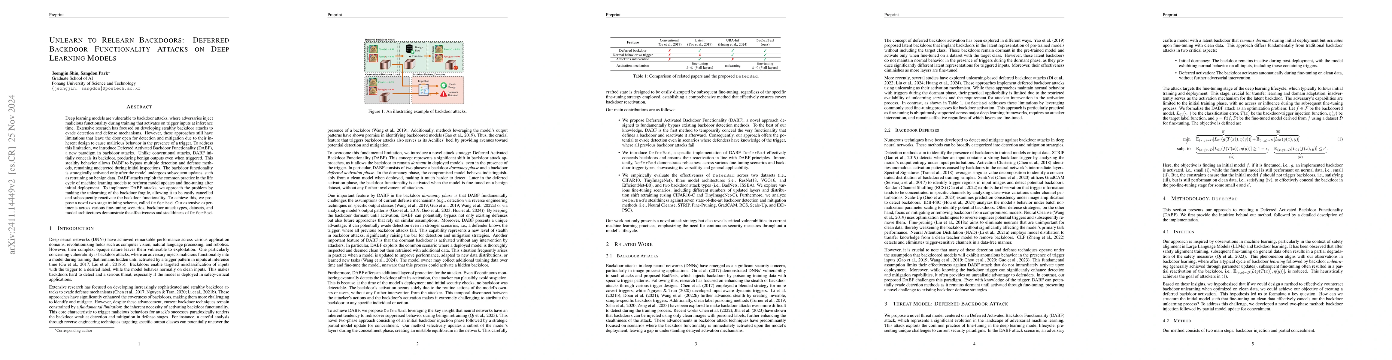 This paper introduces Deferred Backdoor Functionality Attacks (DBFA) on deep learning models, a stealthy attack method that initially produces benign outputs even when triggered. Unlike conventional attacks, DBFA activates malicious functionality only after the model undergoes updates, exploiting the common practice of retraining. The proposed DeferBad two-stage training scheme ensures the backdoor remains unlearnable yet easily reactivated, demonstrating high effectiveness and stealthiness across various scenarios.