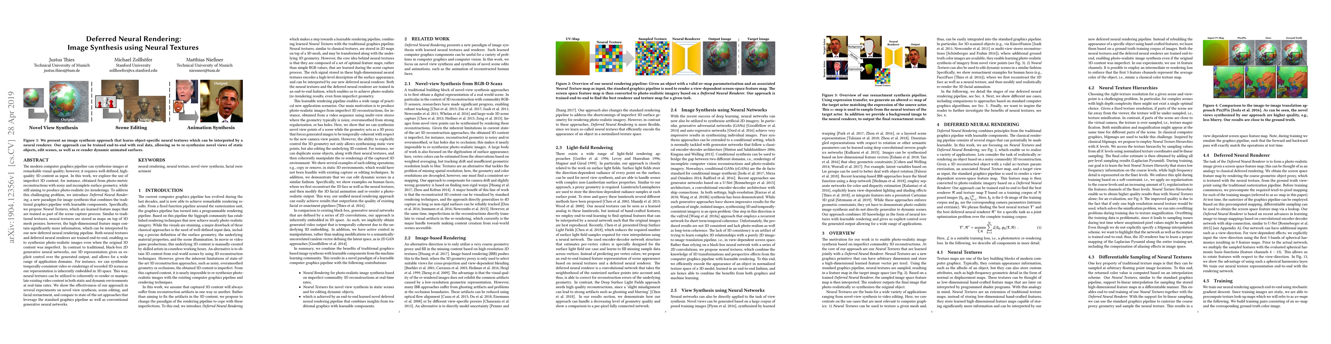 Deferred Neural Rendering introduces Neural Textures—learned feature maps trained during scene capture—to synthesize photo-realistic images from imperfect 3D content. This approach combines traditional graphics with learnable components, enabling real-time, temporally-consistent video re-renderings and scene manipulation.