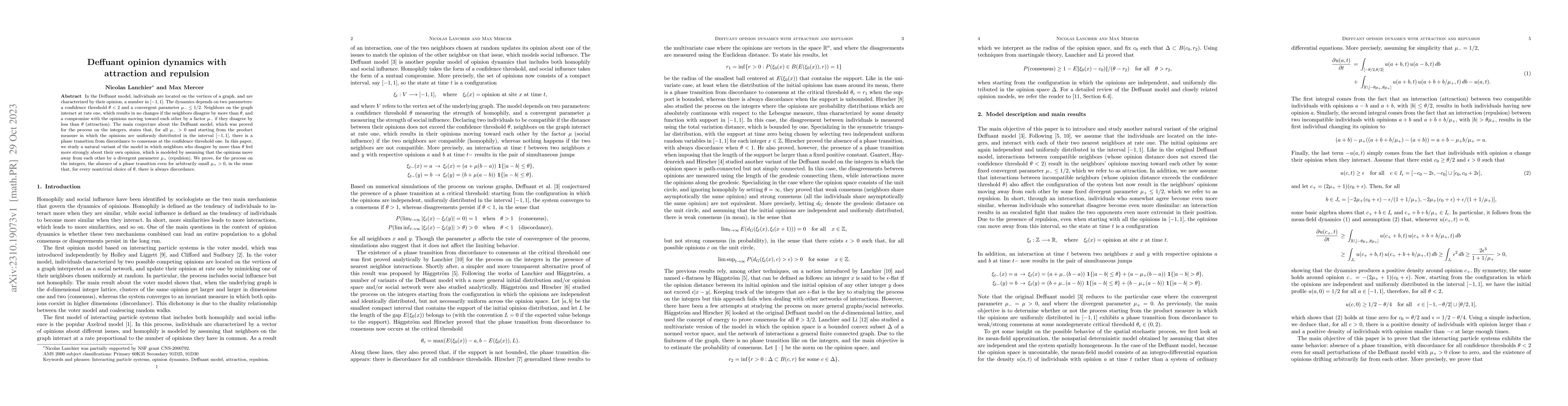 In the Deffuant model, individuals are located on the vertices of a graph, and are characterized by their opinion, a number in $[-1, 1]$. The dynamics depends on two parameters: a confidence threshold $\theta < 2$ and a convergent parameter $\mu_- \leq 1/2$. Neighbors on the graph interact at rate one, which results in no changes if the neighbors disagree by more than $\theta$, and a compromise with the opinions moving toward each other by a factor $\mu_-$ if they disagree by less than $\theta$ (attraction). The main conjecture about the Deffuant model, which was proved for the process on the integers, states that, for all $\mu_- > 0$ and starting from the product measure in which the opinions are uniformly distributed in the interval $[-1, 1]$, there is a phase transition from discordance to consensus at the confidence threshold one. In this paper, we study a natural variant of the model in which neighbors who disagree by more than $\theta$ feel more strongly about their own opinion, which is modeled by assuming that the opinions move away from each other by a divergent parameter $\mu_+$ (repulsion). We prove, for the process on the integers, the absence of a phase transition even for arbitrarily small $\mu_+ > 0$, in the sense that, for every nontrivial choice of $\theta$, there is always discordance.