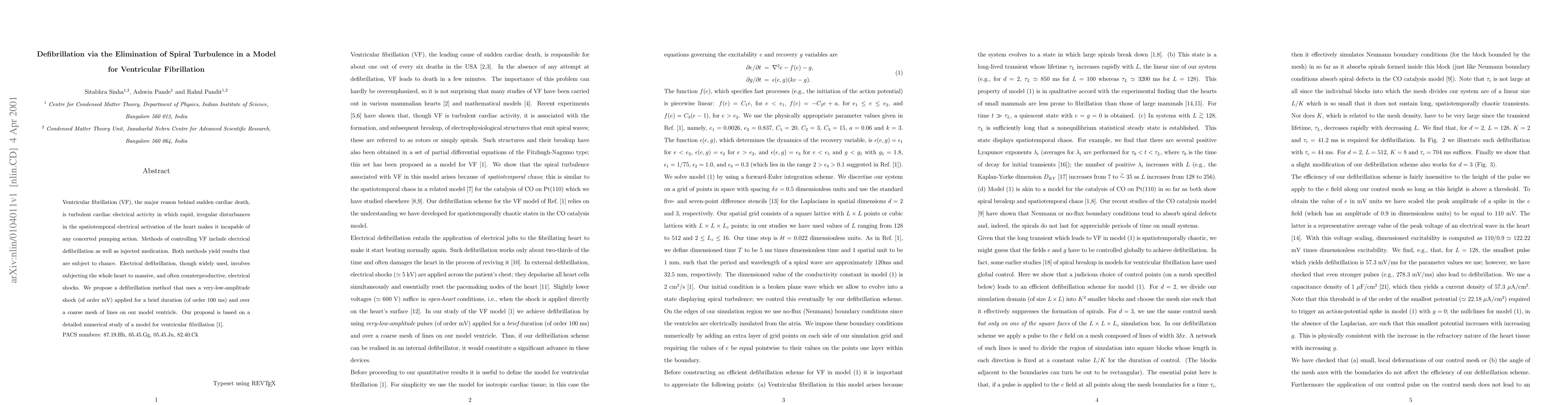 This paper proposes a novel defibrillation method to control ventricular fibrillation by eliminating spiral turbulence through low-amplitude, brief electrical shocks applied over a mesh on a model ventricle, aiming to avoid the large, often harmful shocks traditionally used.