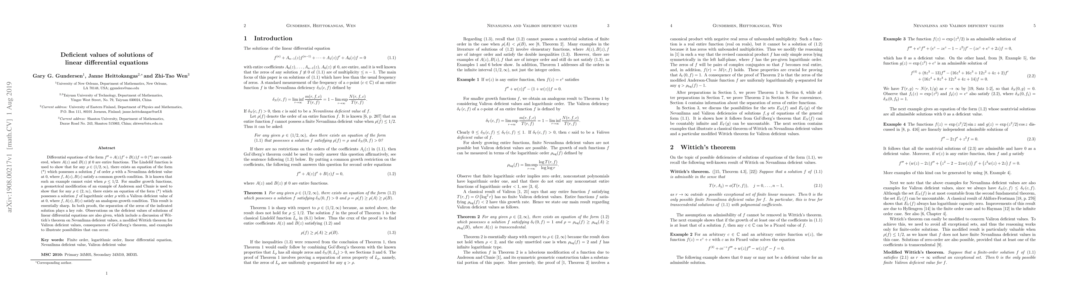 Differential equations of the form $f'' + A(z)f' + B(z)f = 0$ (*) are considered, where $A(z)$ and $B(z) \not\equiv 0$ are entire functions. The Lindel\"of function is used to show that for any $\rho \in (1/2, \infty)$, there exists an equation of the form (*) which possesses a solution $f$ of order $\rho$ with a Nevanlinna deficient value at $0$, where $f, A(z), B(z)$ satisfy a common growth condition. It is known that such an example cannot exist when $\rho \leq 1/2$. For smaller growth functions, a geometrical modification of an example of Anderson and Clunie is used to show that for any $\rho \in (2, \infty)$, there exists an equation of the form (*) which possesses a solution $f$ of logarithmic order $\rho$ with a Valiron deficient value of at $0$, where $f, A(z), B(z)$ satisfy an analogous growth condition. This result is essentially sharp. In both proofs, the separation of the zeros of the indicated solution plays a key role. Observations on the deficient values of solutions of linear differential equations are also given, which include a discussion of Wittich's theorem on Nevanlinna deficient values, a modified Wittich theorem for Valiron deficient values, consequences of Gol'dberg's theorem, and examples to illustrate possibilities that can occur.