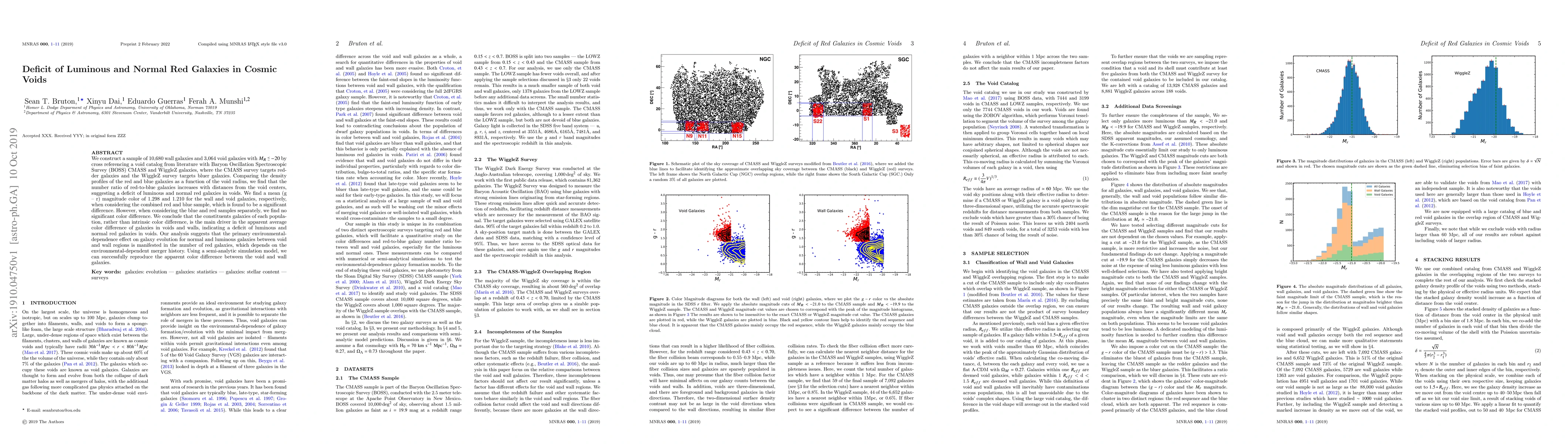 This paper investigates the distribution of luminous and normal red galaxies in cosmic voids compared to walls, finding a deficit of such galaxies in voids. The study uses galaxy samples from BOSS and WiggleZ, revealing that red-to-blue galaxy number ratios increase with distance from void centers, suggesting environmental factors influence galaxy evolution, particularly merger history, affecting the number of red galaxies in voids.