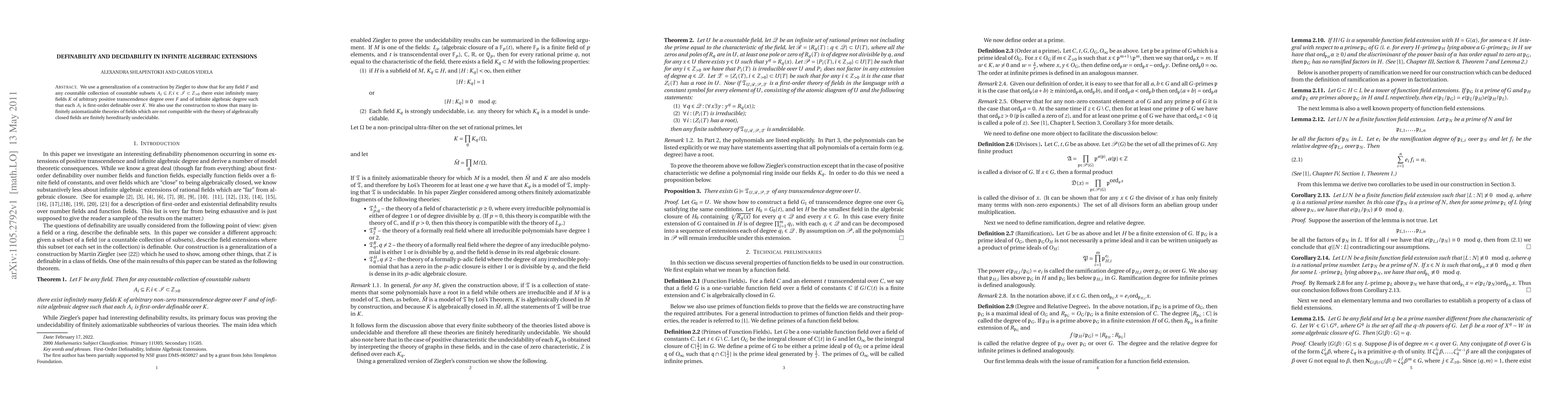 We use a generalization of a construction by Ziegler to show that for any field $F$ and any countable collection of countable subsets $A_i \subseteq F, i \in \calI \subset \Z_{>0}$ there exist infinitely many fields $K$ of arbitrary positive transcendence degree over $F$ and of infinite algebraic degree such that each $A_i$ is first-order definable over $K$. We also use the construction to show that many infinitely axiomatizable theories of fields which are not compatible with the theory of algebraically closed fields are finitely hereditarily undecidable.