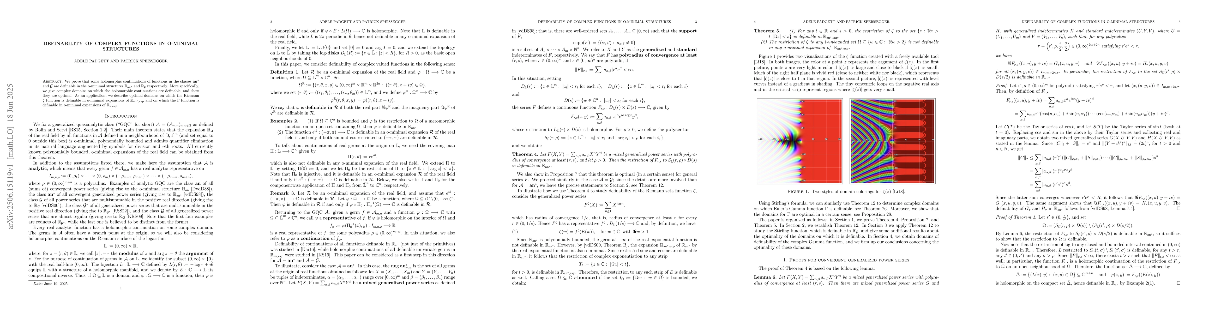 We prove that some holomorphic continuations of functions in the classes $\mathbf{an}^*$ and $\mathcal{G}$ are definable in the o-minimal structures $\mathbb{R}_{\mathrm{an}^*}$ and $\mathbb{R}_{\mathcal{G}}$ respectively. More specifically, we give complex domains on which the holomorphic continuations are definable, and show they are optimal. As an application, we describe optimal domains on which the Riemann $\zeta$ function is definable in o-minimal expansions of $\mathbb{R}_{\mathrm{an}^*,\exp}$ and on which the $\Gamma$ function is definable in o-minimal expansions of $\mathbb{R}_{\mathcal{G},\exp}$.