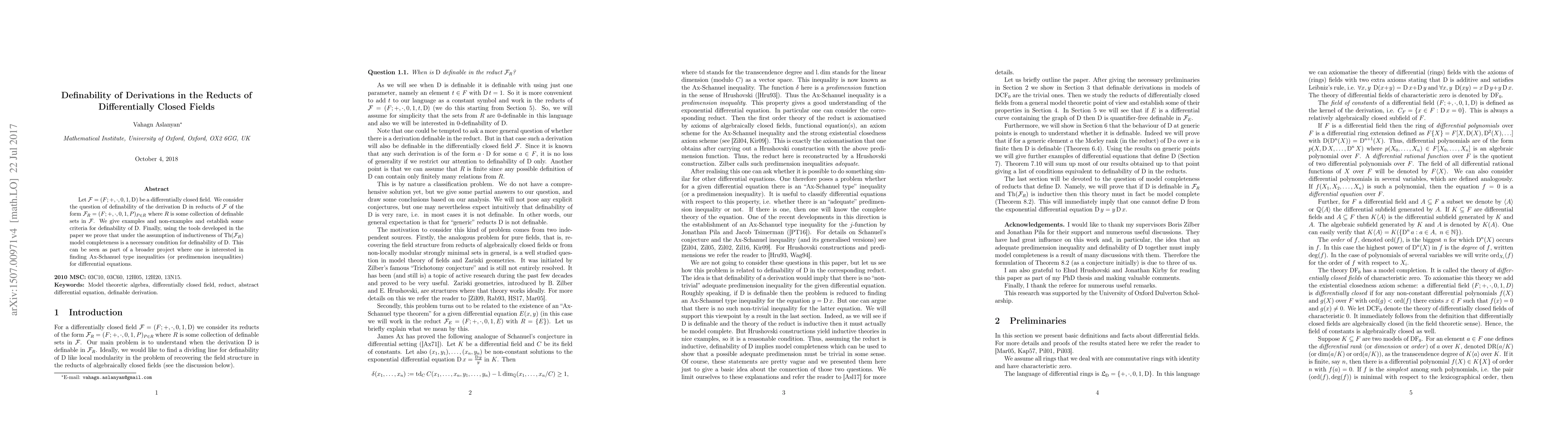 Let $\mathcal{F}=(F;+,\cdot,0,1,D)$ be a differentially closed field. We consider the question of definability of the derivation $D$ in reducts of $\mathcal{F}$ of the form $\mathcal{F}_{R}=(F;+,\cdot,0,1,P)_{P \in R}$ where $R$ is a collection of definable sets in $\mathcal{F}$. We give examples and non-examples and establish some criteria for definability of $D$. Finally, using the tools developed in the paper we prove that under the assumption of inductiveness of $Th(\mathcal{F}_{R})$ model completeness is a necessary condition for definability of $D$. This can be seen as part of a broader project where one is interested in finding Ax-Schanuel type inequalities (or predimension inequalities) for differential equations.