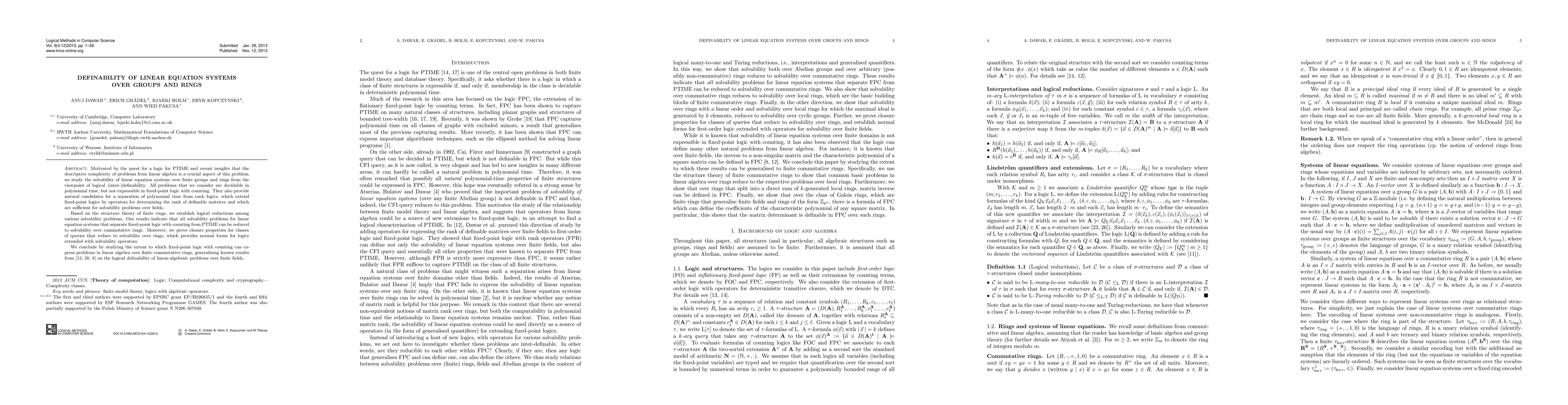 This paper explores the logical definability of solvability for linear equation systems over finite groups and rings, demonstrating that these problems are decidable in polynomial time but not expressible in fixed-point logic with counting. It establishes logical reductions among various solvability problems and shows that those separating fixed-point logic from PTIME can be reduced to solvability over commutative rings.