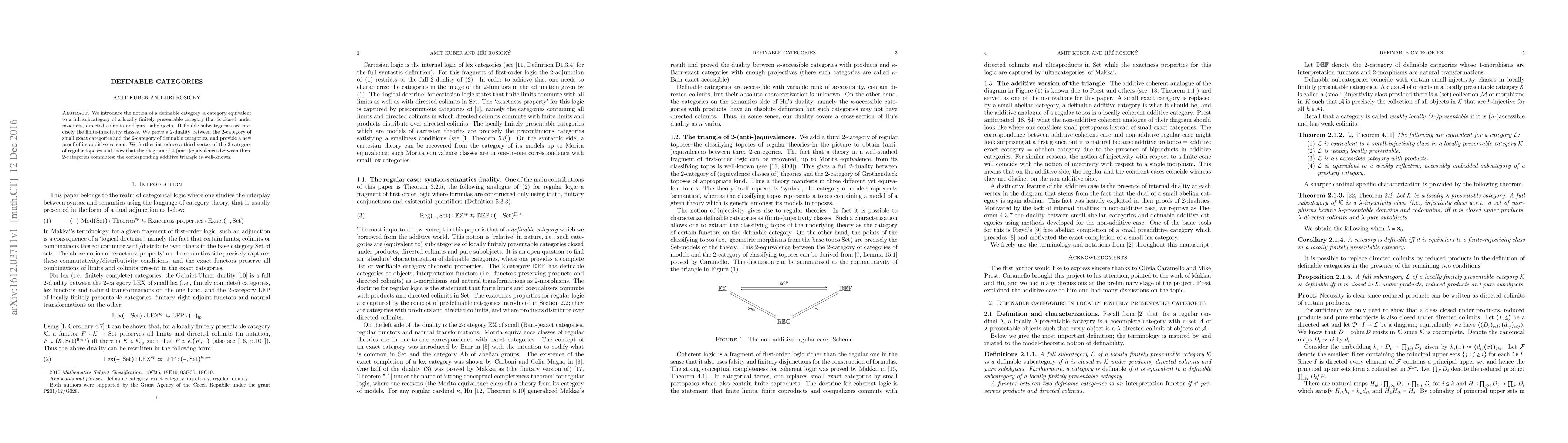 This paper introduces definable categories, a type of category closed under products, directed colimits, and pure subobjects. It establishes a 2-duality between exact categories and definable categories, and extends this to regular toposes, showing the commutativity of the associated diagram.