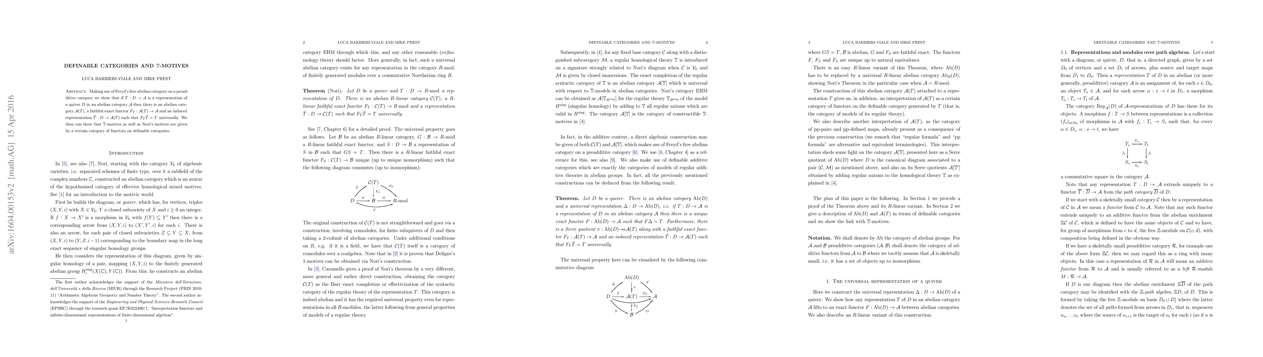Making use of Freyd's free abelian category on a preadditive category we show that if $T:D\rightarrow \mathcal{A}$ is a representation of a quiver $D$ in an abelian category $\mathcal{A}$ then there is an abelian category $\mathcal{A} (T)$, a faithful exact functor $F_T: \mathcal{A} (T) \to \mathcal{A}$ and an induced representation $\tilde T: D \to \mathcal{A} (T)$ such that $F_T\tilde T= T$ universally. We then can show that $\mathbb{T}$-motives as well as Nori's motives are given by a certain category of functors on definable categories.