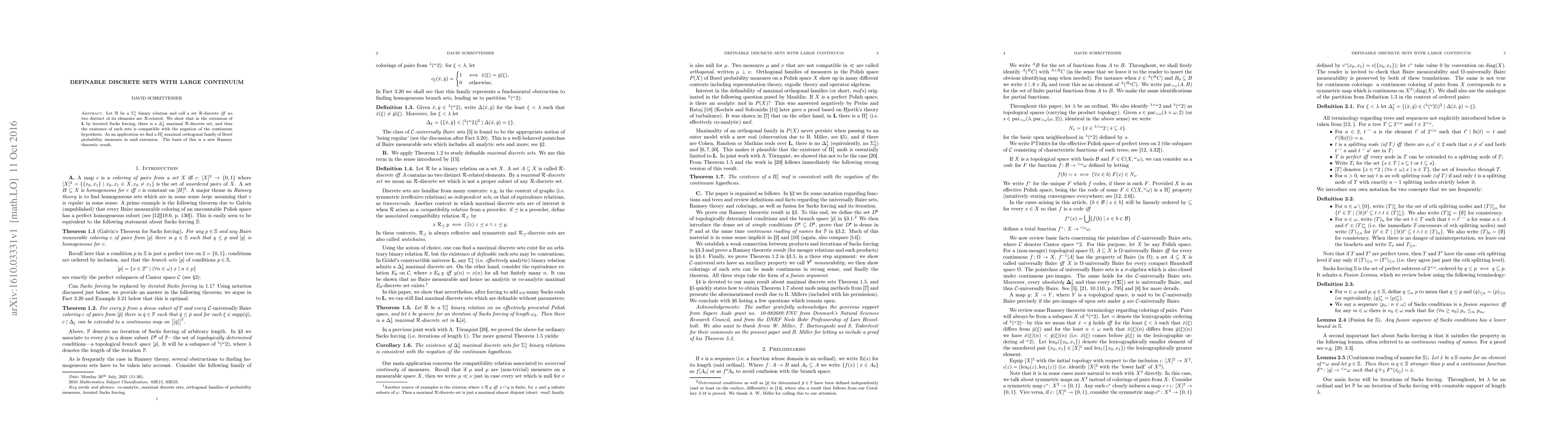 This paper demonstrates the existence of a $\Delta^1_2$ maximal $\mathcal R$-discrete set in the extension of $\mathbf{L}$ via iterated Sacks forcing, showing compatibility with the negation of the continuum hypothesis. It also applies this result to find a $\Pi^1_1$ maximal orthogonal family of Borel probability measures, supported by a new Ramsey theoretic finding.