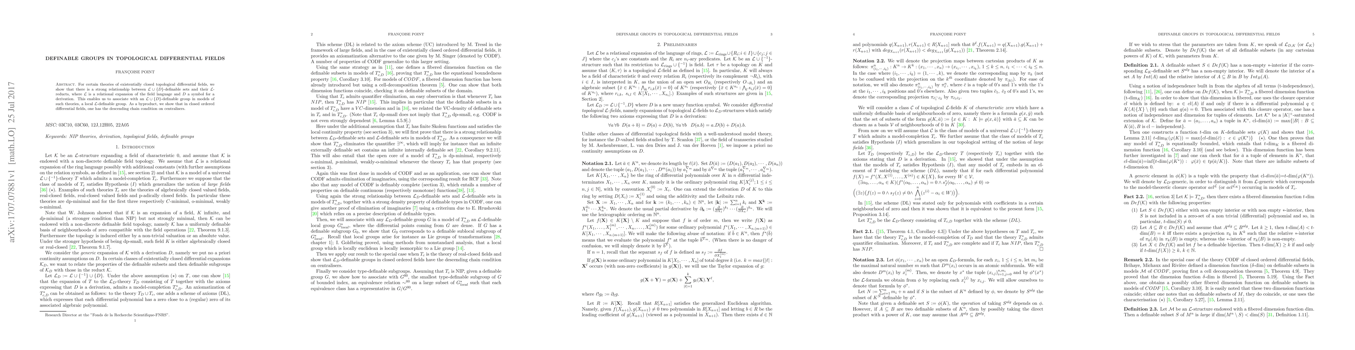 This paper establishes a strong link between $\mathcal L\cup\{D\}$-definable sets and their $\mathcal L$-reducts in existentially closed topological differential fields, allowing the association of $\mathcal L\cup\{D\}$-definable groups with local $\mathcal L$-definable groups. Additionally, it demonstrates the descending chain condition on centralisers in closed ordered differential fields.