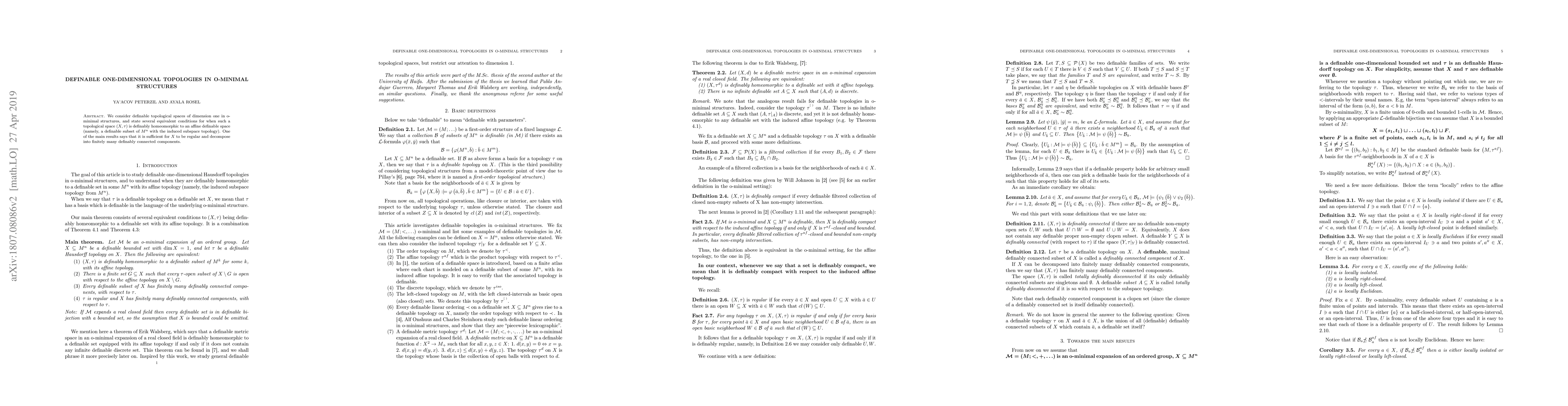 This paper explores definable one-dimensional topological spaces within o-minimal structures, establishing conditions under which such spaces are definably homeomorphic to affine definable spaces. The key result is that regularity and finite definably connected components are sufficient for this homeomorphism.