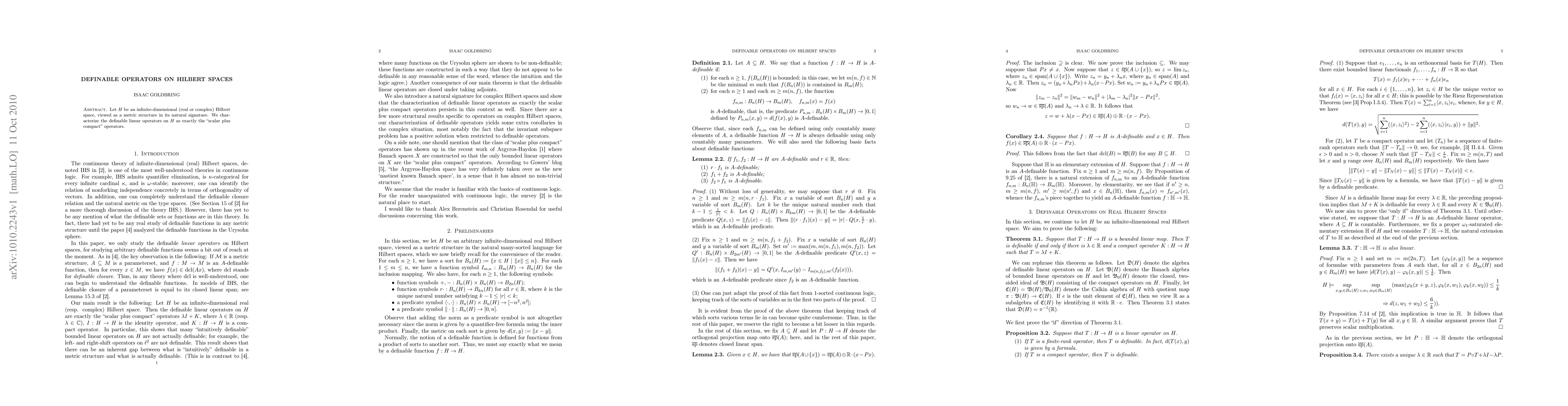 Summary: The paper characterizes definable linear operators on infinite-dimensional Hilbert spaces as those that can be expressed as the sum of a scalar multiple of the identity and a compact operator. This provides a precise classification within the framework of metric structures.