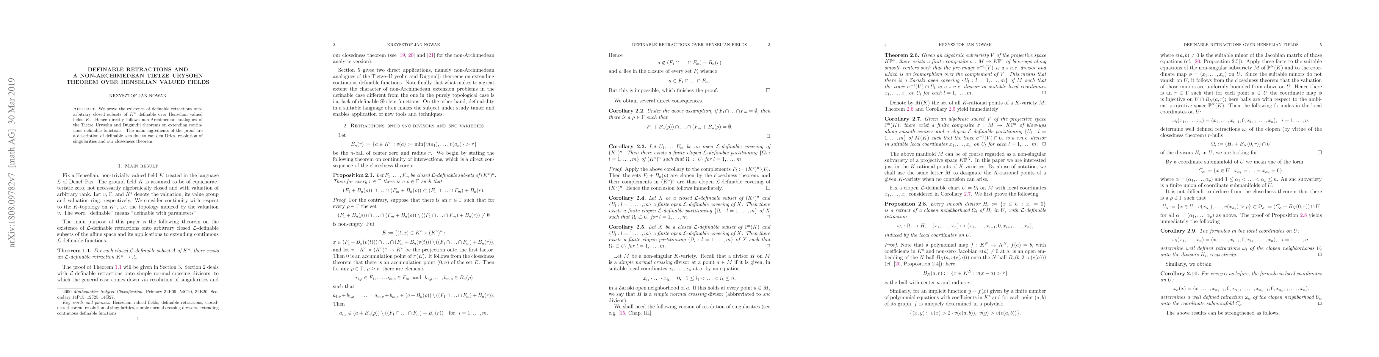 This paper proves the existence of definable retractions onto closed subsets in $K^{n}$ over Henselian valued fields $K$, leading to non-Archimedean versions of the Tietze--Urysohn and Dugundji theorems. The proof relies on van den Dries' description of definable sets, resolution of singularities, and a closedness theorem.