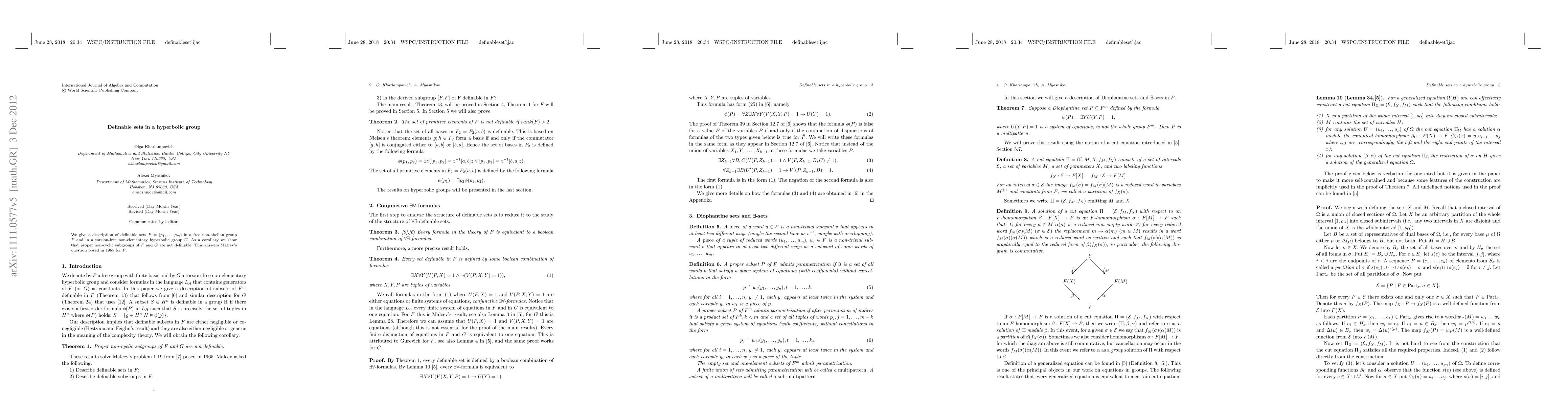We give a description of definable sets $P=(p_1,..., p_m)$ in a free non-abelian group $F$ and in a torsion-free non-elementary hyperbolic group $G$ that follows from our work on the Tarski problems. This answers Malcev's question for $F$. As a corollary we show that proper non-cyclic subgroups of $F$ and $G$ are not definable and prove Bestvina and Feighn's result that definable subsets $P=(p)$ in a free group are either negligible or co-negligible in their terminology.