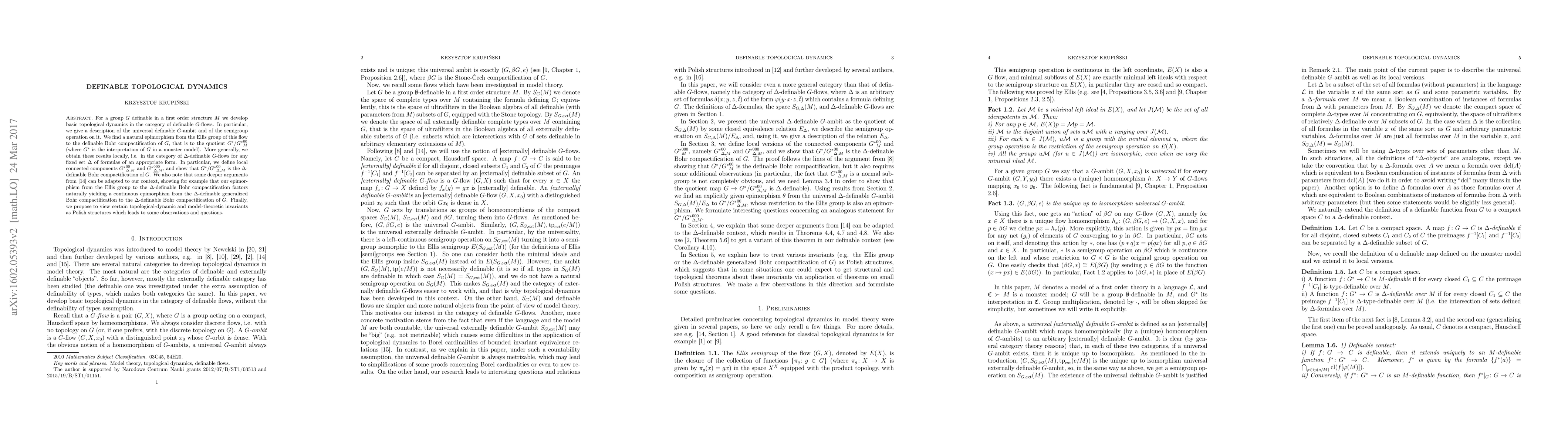 For a group $G$ definable in a first order structure $M$ we develop basic topological dynamics in the category of definable $G$-flows. In particular, we give a description of the universal definable $G$-ambit and of the semigroup operation on it. We find a natural epimorphism from the Ellis group of this flow to the definable Bohr compactification of $G$, that is to the quotient $G^*/{G^*}^{00}_M$ (where $G^*$ is the interpretation of $G$ in a monster model). More generally, we obtain these results locally, i.e. in the category of $\Delta$-definable $G$-flows for any fixed set $\Delta$ of formulas of an appropriate form. In particular, we define local connected components ${G^*}^{00}_{\Delta,M}$ and ${G^*}^{000}_{\Delta,M}$, and show that $G^*/{G^*}^{00}_{\Delta,M}$ is the $\Delta$-definable Bohr compactification of $G$. We also note that some deeper arguments from the topological dynamics in the category of externally definable $G$-flows can be adapted to the definable context, showing for example that our epimorphism from the Ellis group to the $\Delta$-definable Bohr compactification factors naturally yielding a continuous epimorphism from the $\Delta$-definable generalized Bohr compactification to the $\Delta$-definable Bohr compactification of $G$. Finally, we propose to view certain topological-dynamic and model-theoretic invariants as Polish structures which leads to some observations and questions.