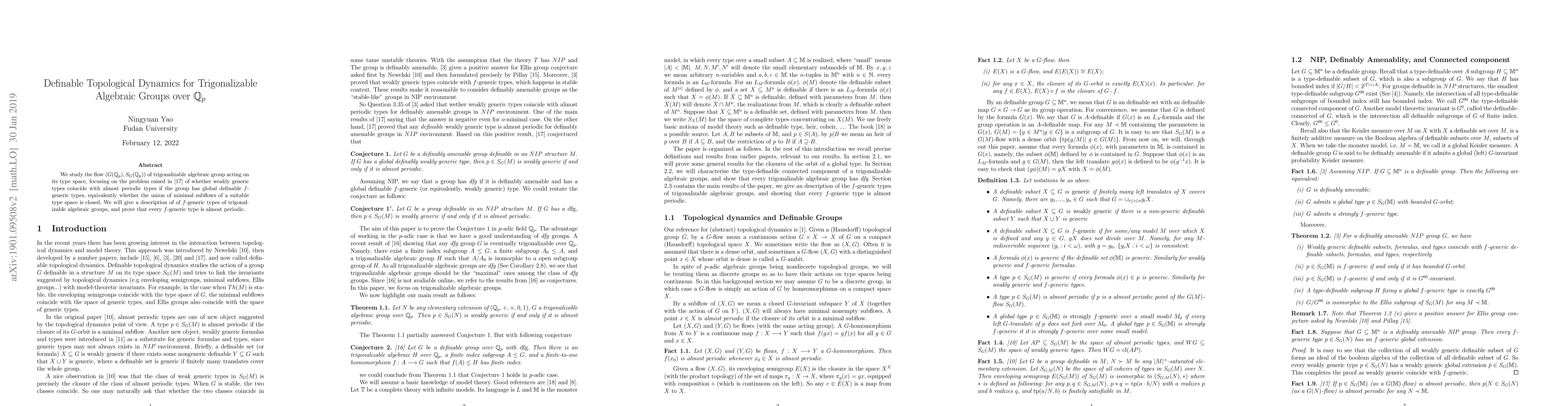 We study the flow (G(Qp); SG(Qp)) of trigonalizable algebraic group acting on its type space, focusing on the problem raised in [17] of whether weakly generic types coincide with almost periodic types if the group has global definable f-generic types, equivalently whether the union of minimal subflows of a suitable type space is closed. We will give a description of of f-generic types of trigonalizable algebraic groups, and prove that every f-generic type is almost periodic.