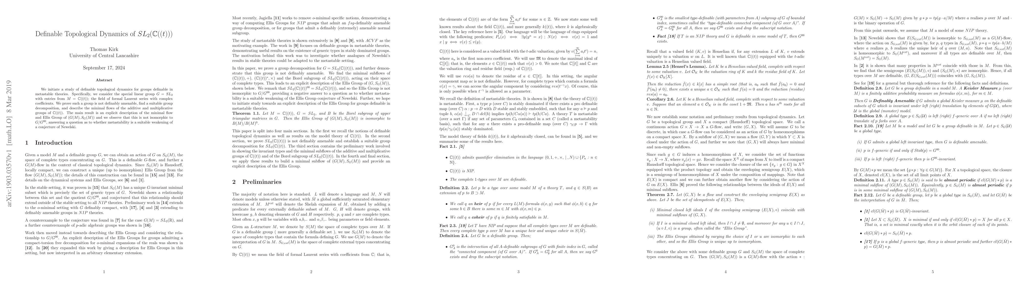 We initiate a study of definable topological dynamics for groups definable in metastable theories. Specifically, we consider the special linear group $G = SL_2$ with entries from $M = \mathbb{C}((t))$; the field of formal Laurent series with complex coefficients. We prove such a group is not definably amenable, find a suitable group decomposition, and describe the minimal flows of the additive and multiplicative groups of $\mathbb{C}((t))$. The main result is an explicit description of the minimal flow and Ellis Group of $(G(M),S_G(M))$ and we observe that this is not isomorphic to $G/G^{00}$, answering a question as to whether metastability is a suitable weakening of a conjecture of Newelski.