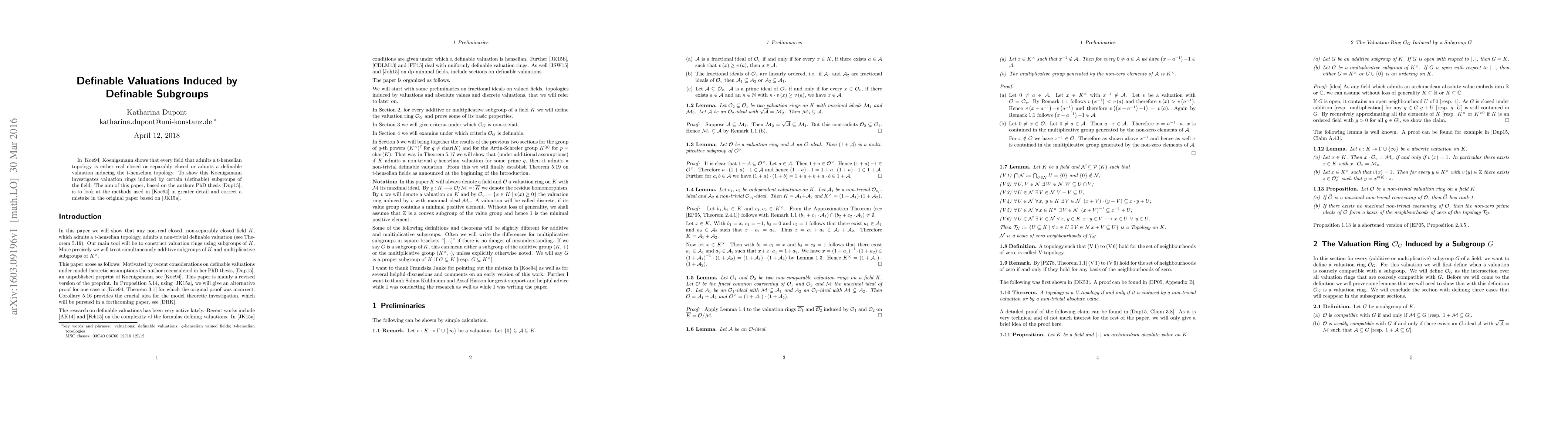 This paper delves into the methods presented by Koenigsmann in his preprint "Definable Valuations," focusing on valuation rings induced by definable subgroups of fields that have a t-henselian topology. It corrects an error in the original work and expands on the techniques used to demonstrate that such fields are either real closed, separably closed, or admit a definable valuation.
