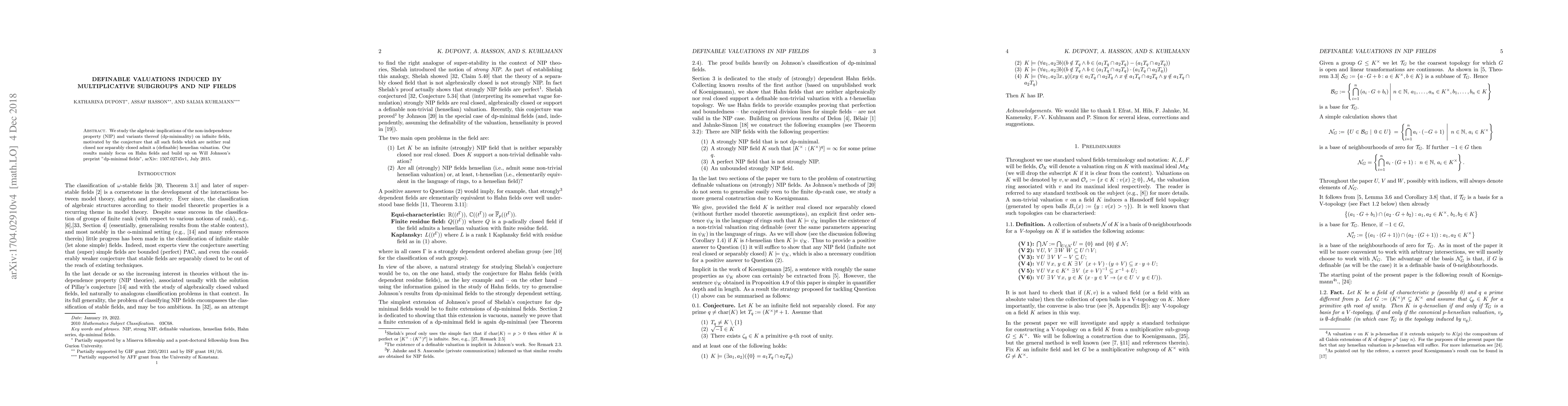 This paper explores how the non-independence property (NIP) and dp-minimality influence the structure of infinite fields, particularly focusing on the existence of definable henselian valuations in Hahn fields, building on Johnson's findings in "dp-minimal fields." The central conjecture posits that non-real closed, non-separably closed fields possess such valuations.