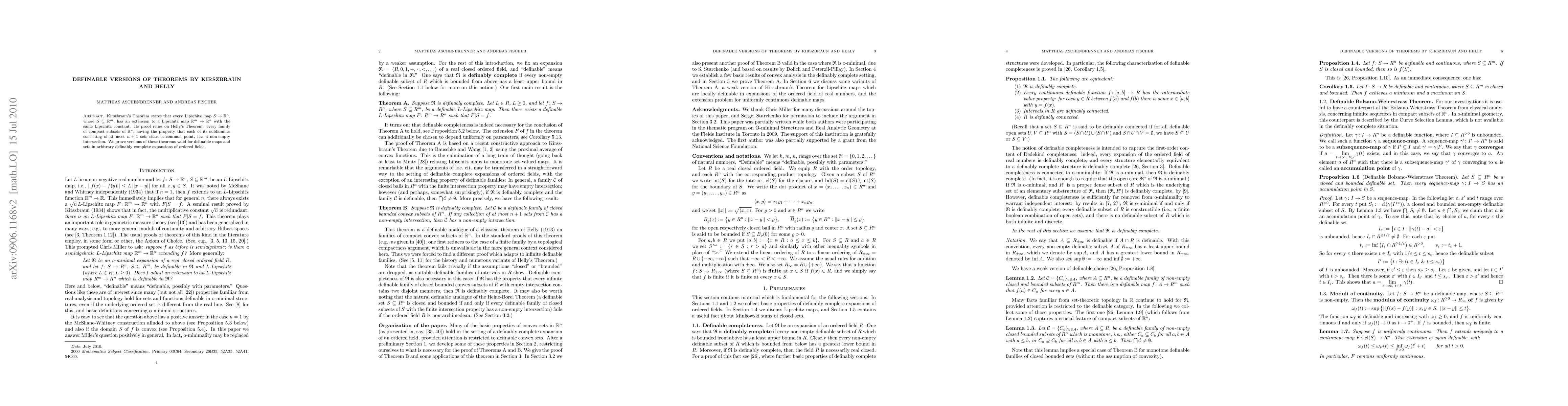 This paper proves definable versions of Kirszbraun's and Helly's theorems for definable maps and sets within definably complete expansions of ordered fields, extending the classical results to a more general mathematical context.