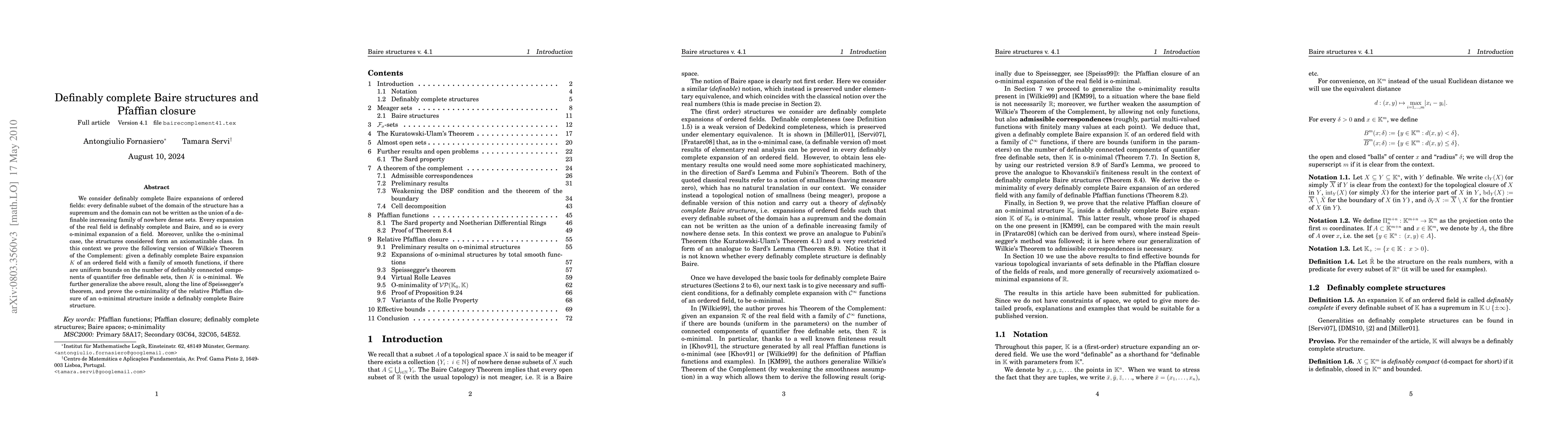 This paper explores definably complete and Baire expansions of ordered fields, proving versions of classical theorems like Kuratowski-Ulam's Theorem and Sard's Lemma within this context. It establishes the o-minimality of certain structures under uniform bounds on the number of definably connected components.