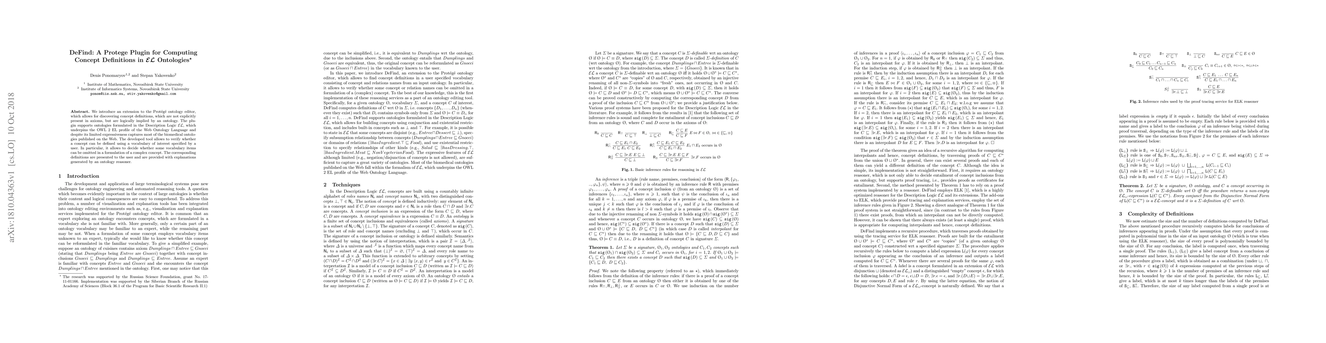 The DeFind plugin for Protege enables the discovery of implicitly defined concepts in EL ontologies, facilitating verification of concept definitions and aiding in the simplification of complex concepts by suggesting omitted vocabulary items, with explanations generated by an ontology reasoner.