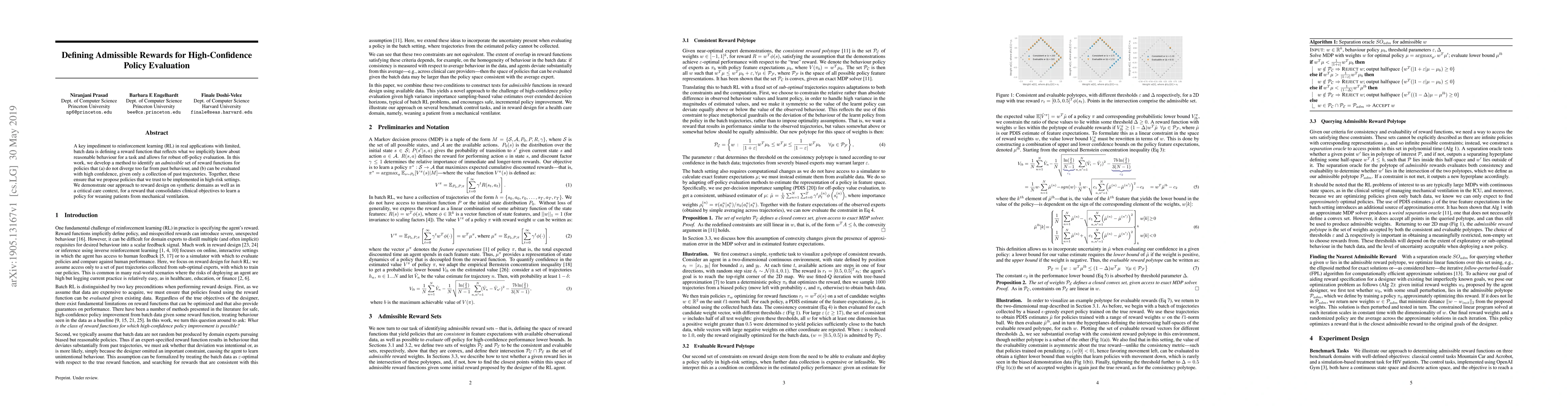 This paper proposes a method for identifying admissible reward functions in reinforcement learning that align with known reasonable behaviors and can be evaluated with high confidence using limited, batch data. The approach ensures the proposed policies are trustworthy for high-risk applications, demonstrated through synthetic and critical care scenarios involving patient ventilation weaning.