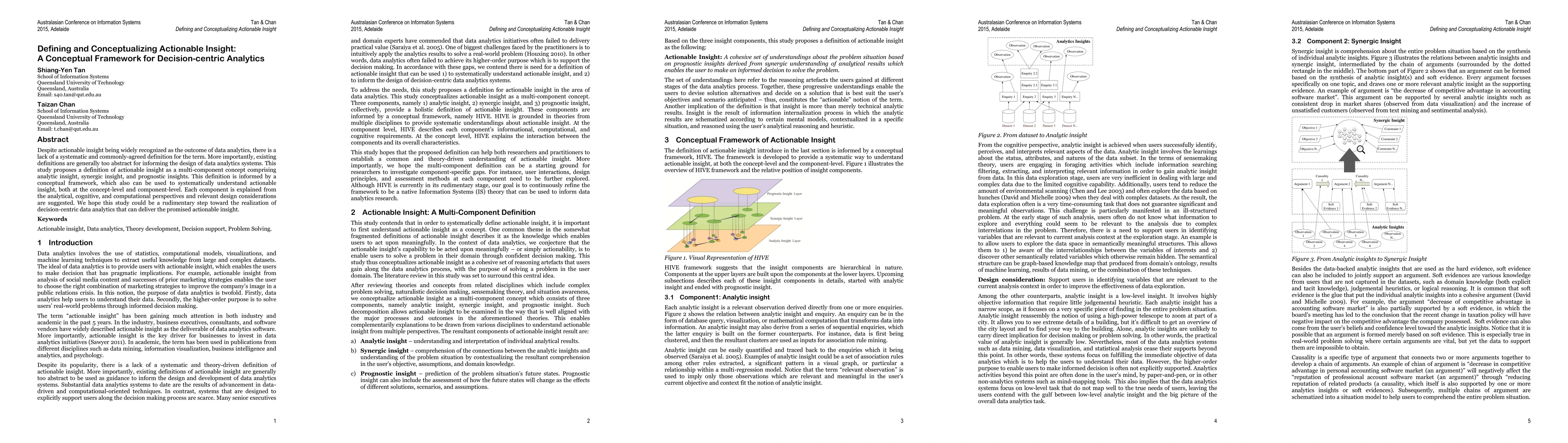 This paper defines actionable insight in data analytics as a multi-component concept comprising analytics insight, synergic insight, and prognostic insights, grounded in various theories. It introduces a conceptual framework detailing each component's analytical, cognitive, and computational requirements, aiming to guide the design of data analytics systems for delivering actionable insights.