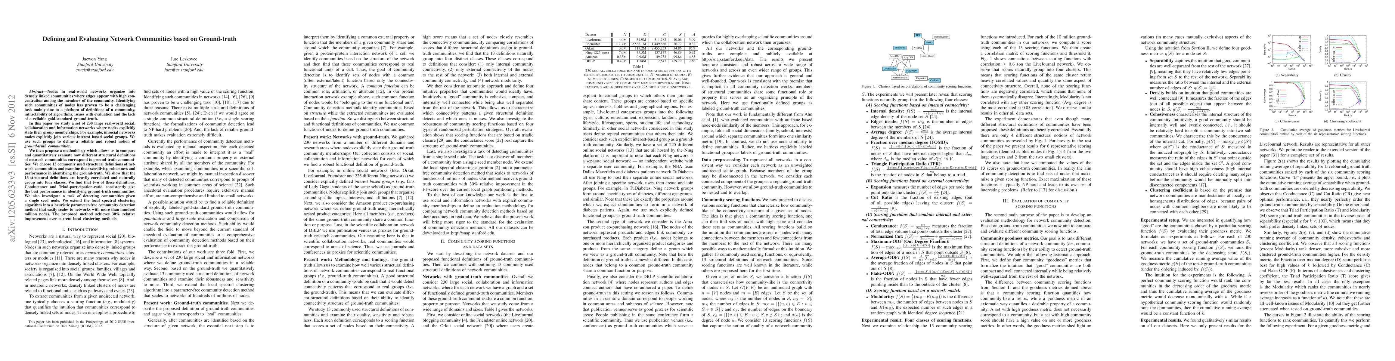 This paper evaluates 13 structural definitions of network communities against ground-truth communities derived from explicitly stated group memberships in 230 large real-world networks. It identifies Conductance and Triad-participation-ratio as the most effective methods, and introduces a scalable heuristic for community detection from a single seed node, achieving a 30% improvement over existing local clustering methods.